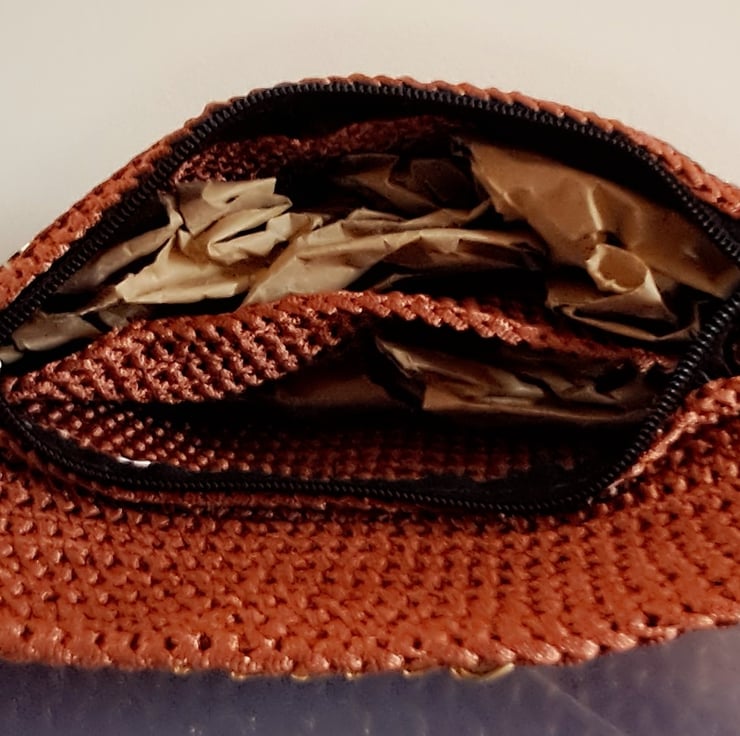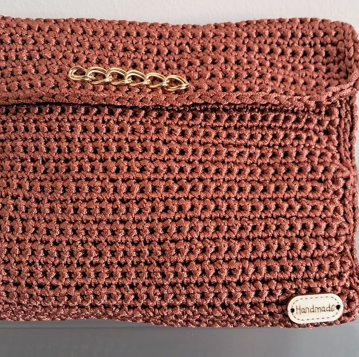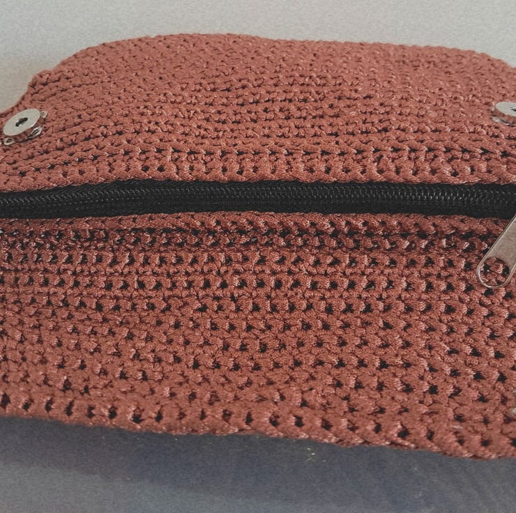 A copper coloured handmade, crocheted clutch bag with chain decoration to the front flap, zip fastening, magnetic snap clasps, wrist strap and inside divided into two pockets.