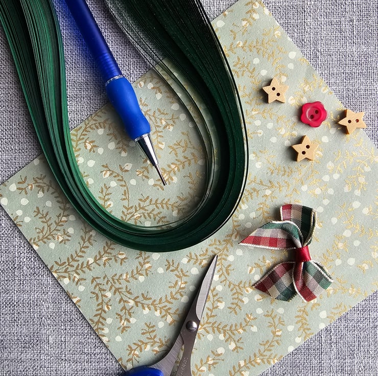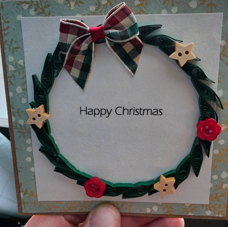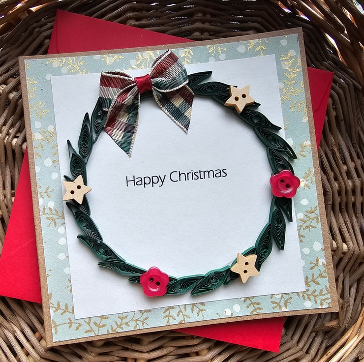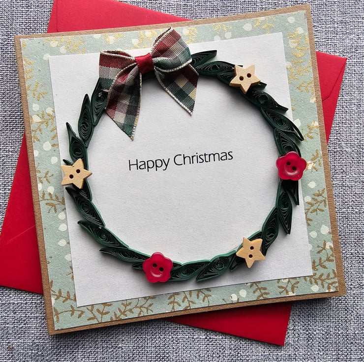 This card is handmade with love and care using quality materials : a brown kraft 5" x 5" card, special textured paper (recycled cotton paper), dark green quilling paper, buttons and a tartan ribbon bow. I have added a photo that shows the materials and tools used. The card is left blank inside for your own message. The greeting is printed on white sketching paper. The card is not very flat due to the quilling and buttons so if posted you need to bear in mind that the postage will be for a large letter. There is only one exactly the same available so it is truly unique.