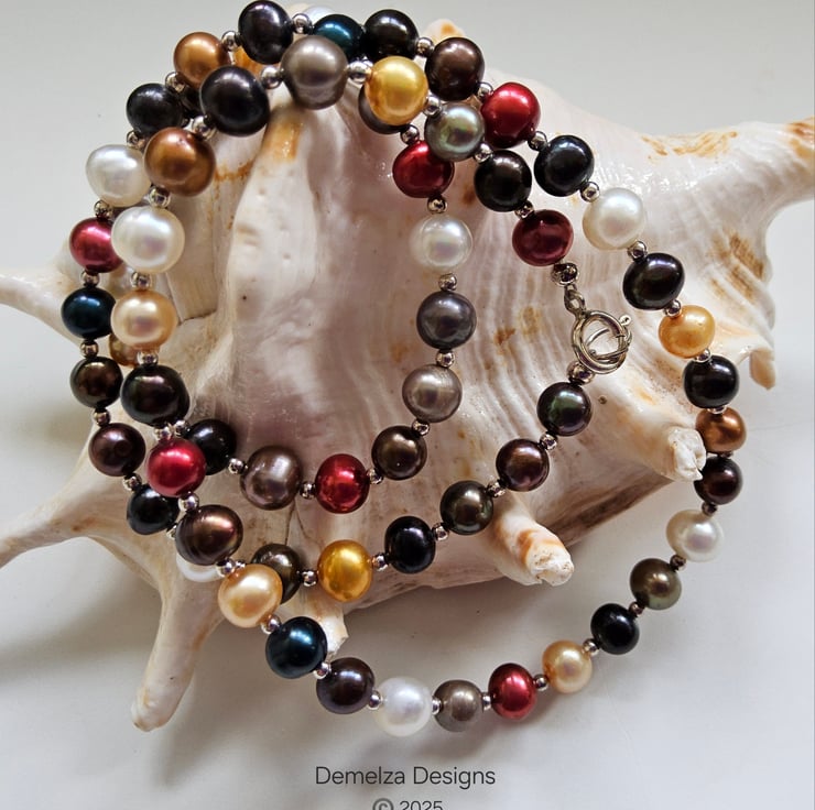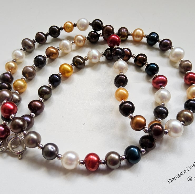 This very unique eye catching genuine multicoloured freshwater culture pearl necklace has been hand crafted and designed in Cornwall. Between each pearl is a tiny 2mm sterling silver spacer bead, finished off with a sterling silver clasp.