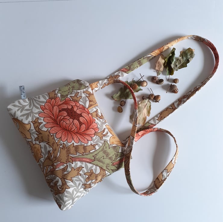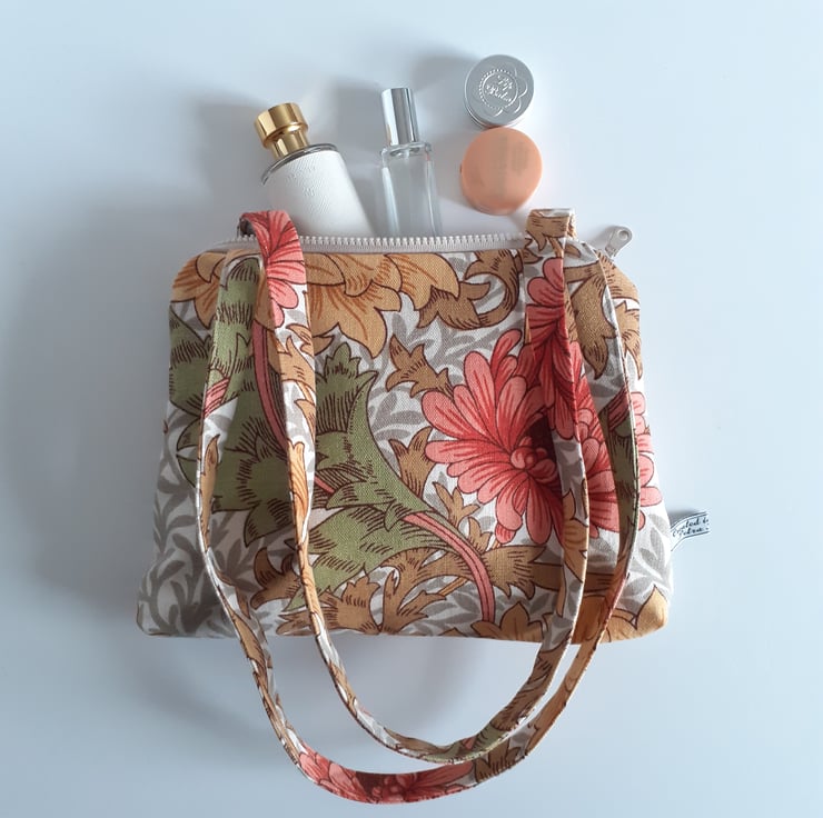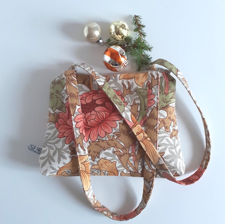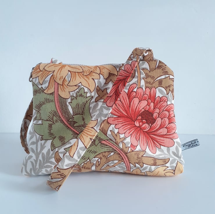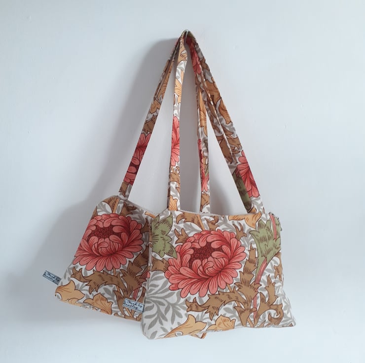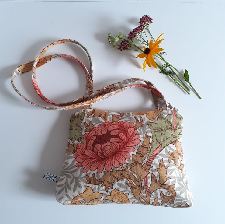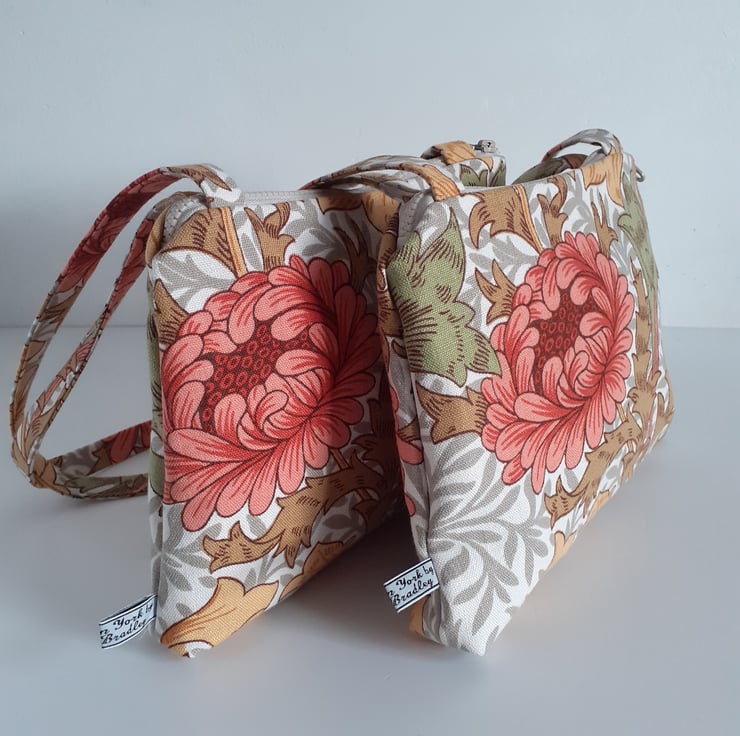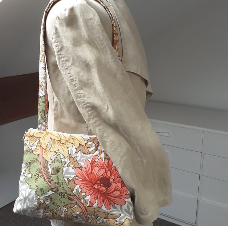 This shoulder bag or handbag with its chunky zip, is upcycled from a classic vintage William Morris fabric called Chrysanthemum. Its autumnal design features bold leaves, tendrils, and flowers in a muted autumnal palette.