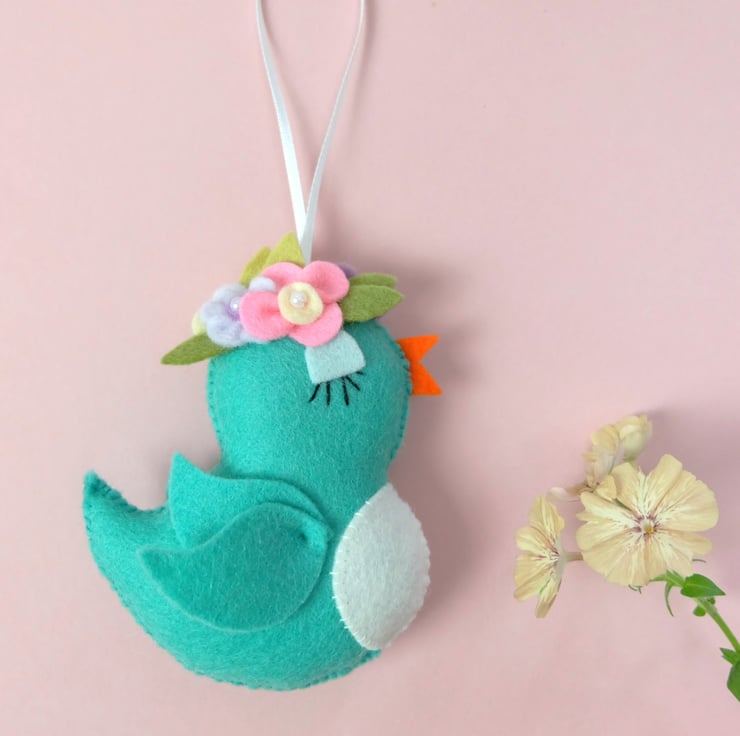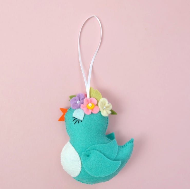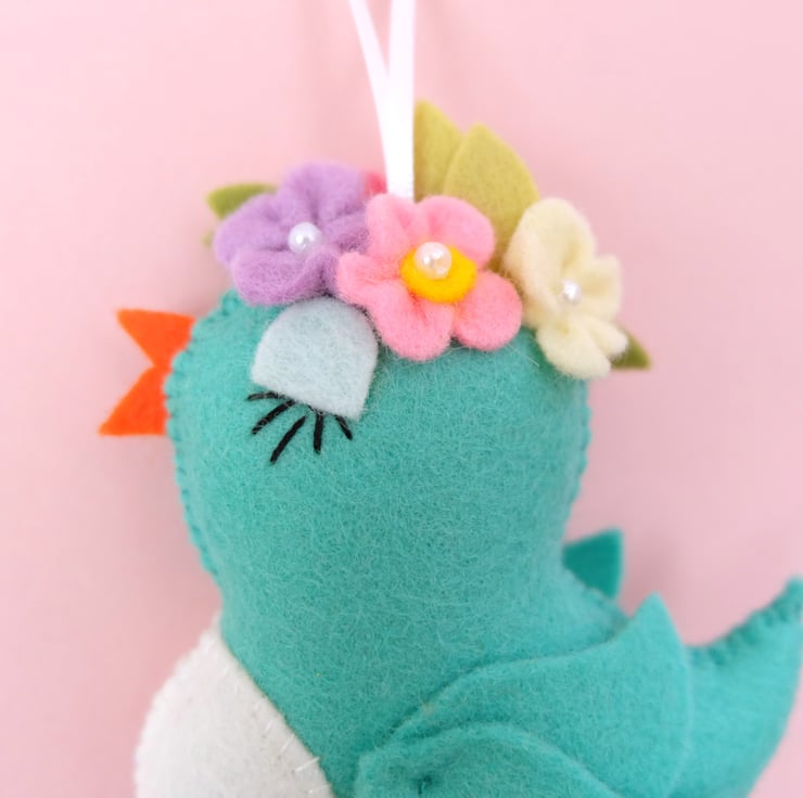 I have designed this sweet little turquoise and white bird and hand cut and carefully sewn all the elements; from the felt body, breast and wings, to the orange beak, blue eyelids, flowers and leaves. I've cut and sewn the little felt flowers, which are stitched to the head and have pearl coloured beads in their centres. There are five coloured flowers in total and five leaves. On the bird's head, I've hand sewn eyelashes using black embroidery thread. The bird is stuffed with soft polyester toy filling.
