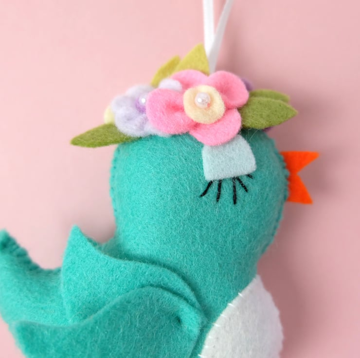 This pretty turquoise wool felt retro bird decoration has an adorable felt flower and leaf crown, highlighted with pearl coloured beads. She can by hung all year round, or specifically for a christening or baby shower, parties, Easter or in a brightly coloured Christmas theme.