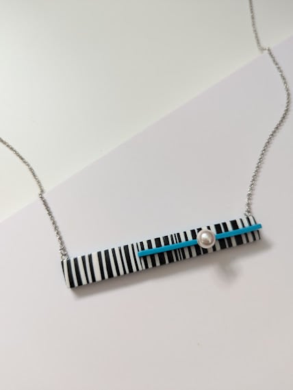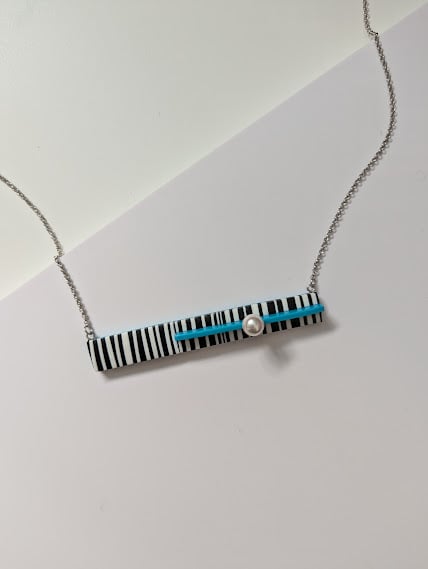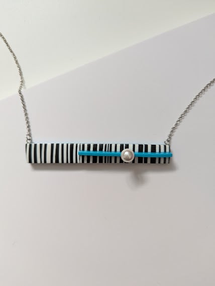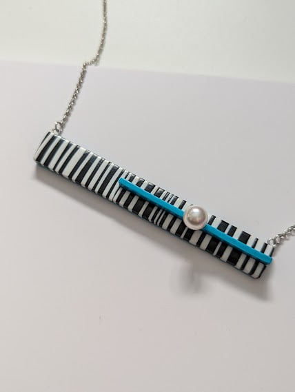 Make a statement with our new collection of handcrafted polymer clay jewelry. Each piece showcases a unique, hand-built striped pattern paired with a vibrant pop of color and a luminous pearl.