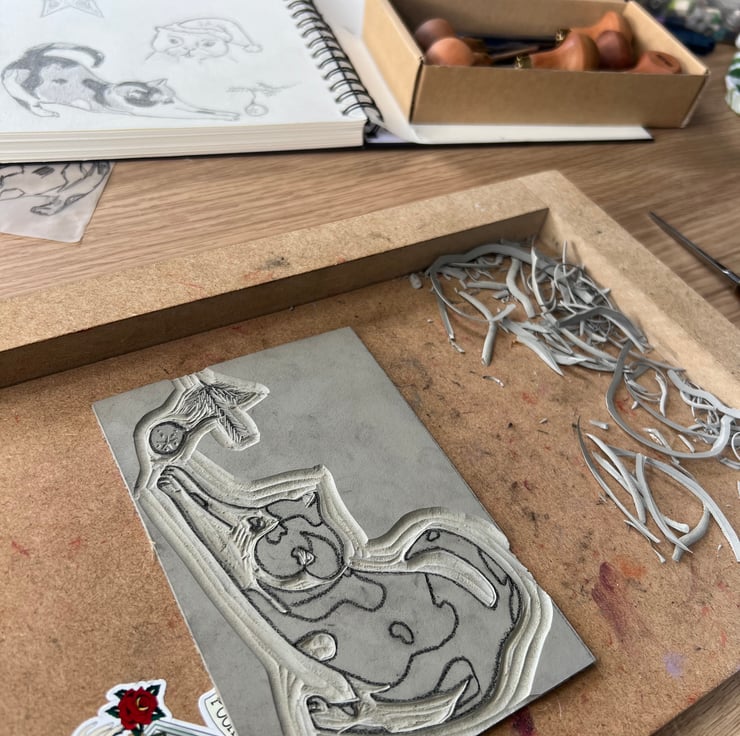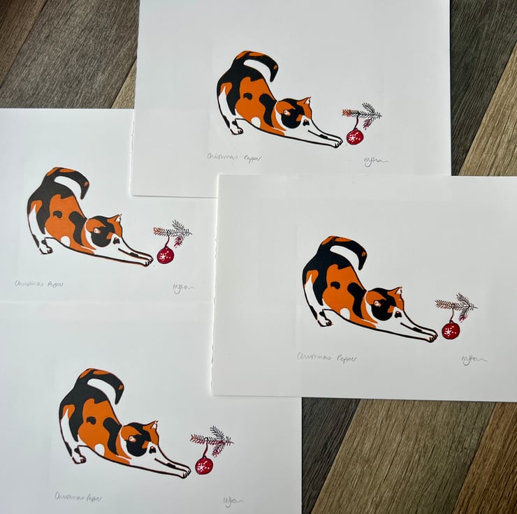Inspired by my sister-in-law and her partner’s cat, Pepper. She has a such a lovely fur pattern which I thought would be beautiful in lino print. Plus, coming up to Christmas, I wanted to add a festive twist.