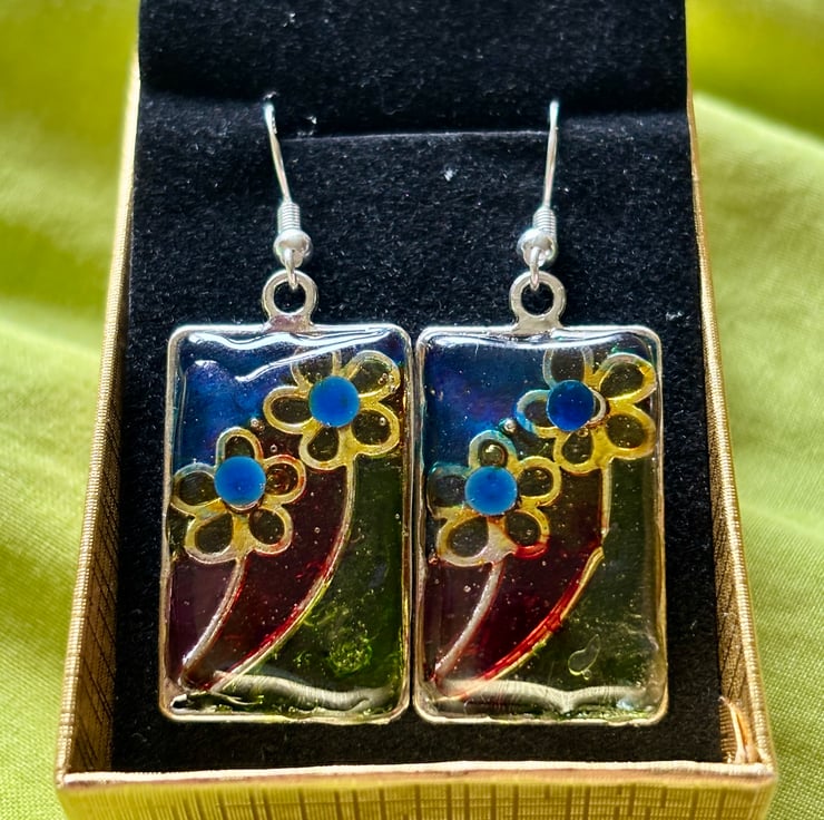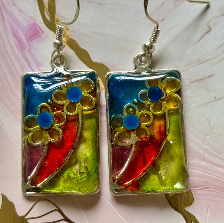 This is a pair of metal framed stain glass effect earrings. There are outlined metal flowers that have been coloured with different colours of glass paint and a small diamonte crystal in the centre of each and encased in resin. The hook is made from Sterling silver.