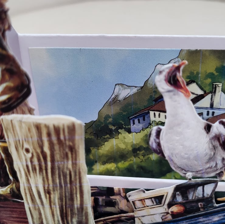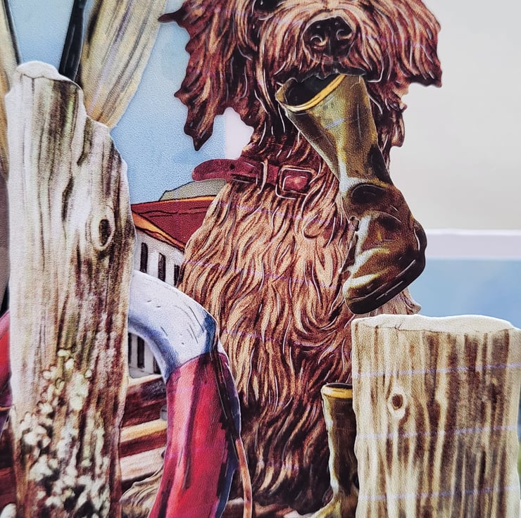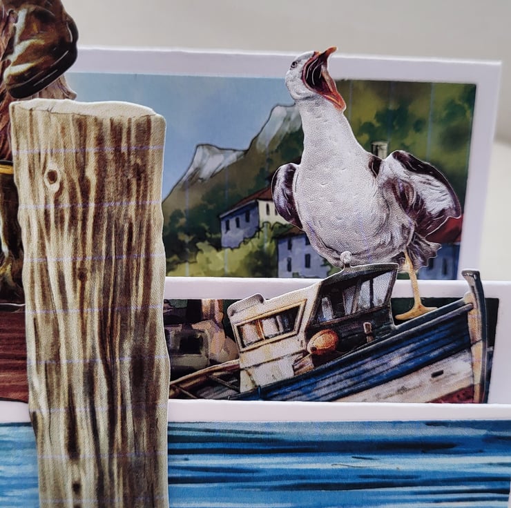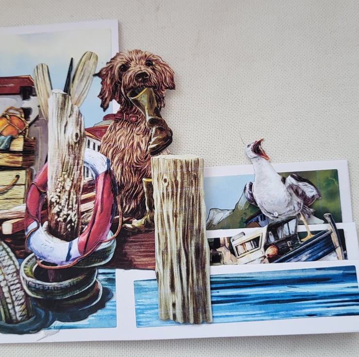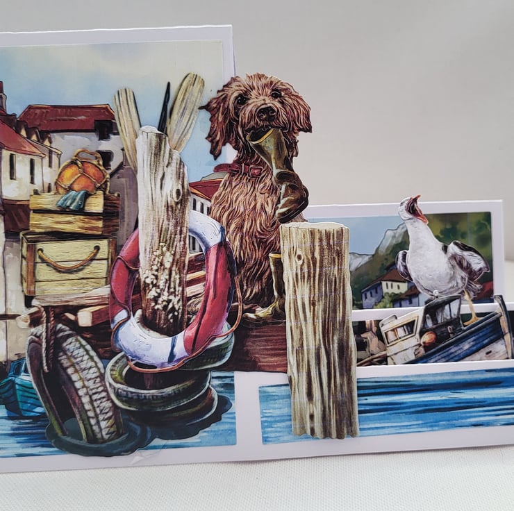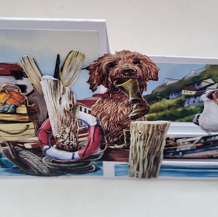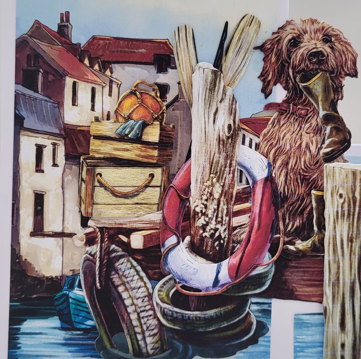 It has a fisherman's dog standing on the pontoon looking after the fisherman's equipment. In the distance is some houses and a little boat. With a seagull. This card has been left blank for your own message.