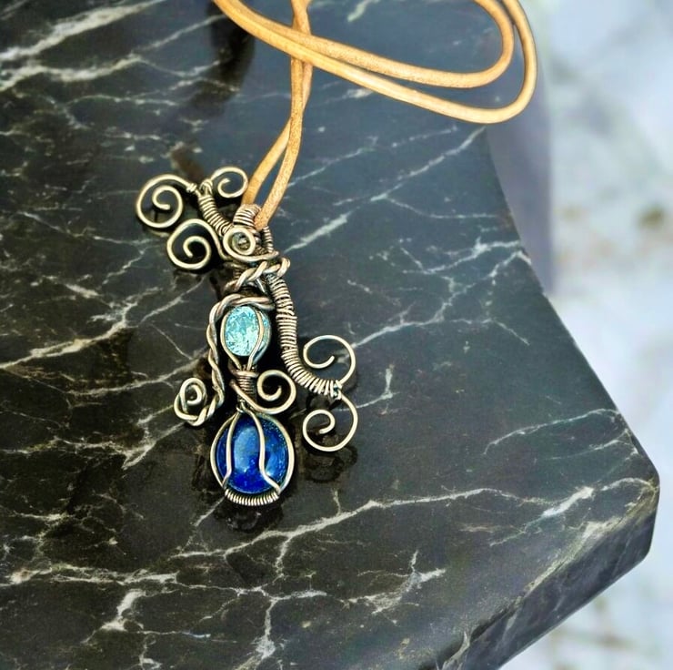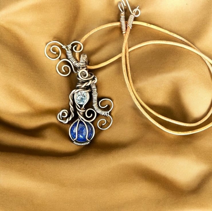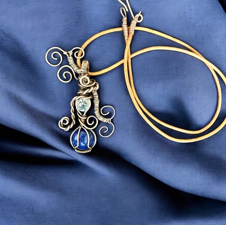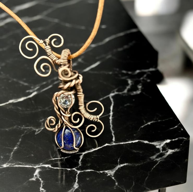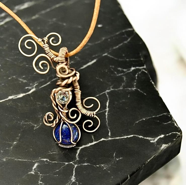 I have made this necklace using solid copper which has been intentionally oxidised, then carefully polished to bring out the highlights of oxidisation .The necklace features a beautiful 12mm Lapis Lazuli & Cubic Zirconia which are secured in a detailed basket and wire wrap design. I have attached this pendant to a 20” Leather Cord but the pendant can be easily removed and attached to a chain of your choice.
