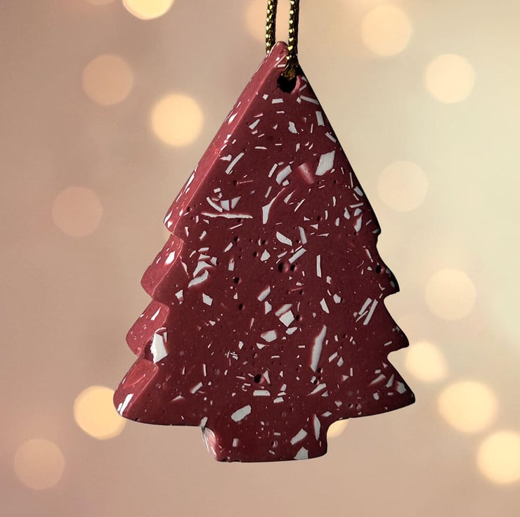 Elevate your holiday decor with our handcrafted confetti plum terrazzo treeChristmas ornament. Searching for a unique, eye-catching sustainable Christmas tree decoration? Our handmade plum coloured terrazzo tree ornament is the perfect addition to your holiday festive decor