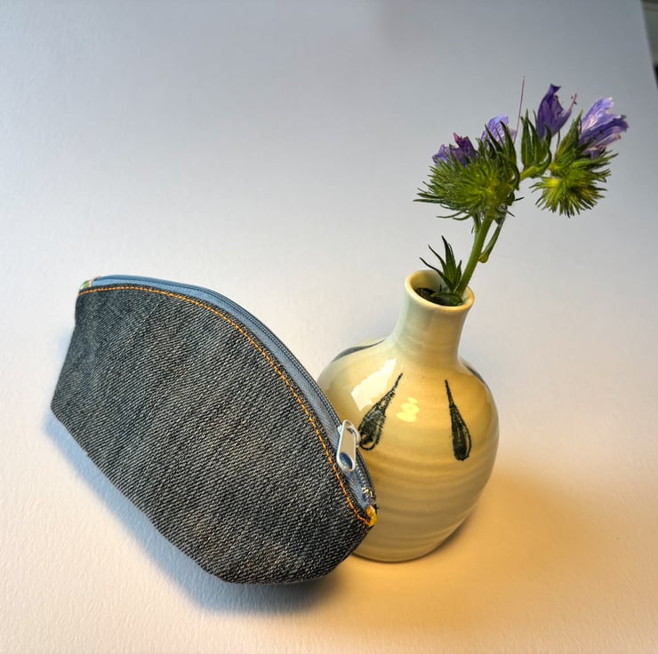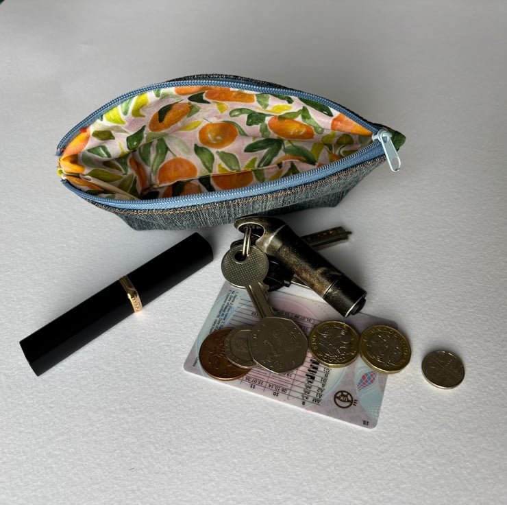 This cute, upcycled denim purse is lined with a pretty cotton fabric with a design of oranges on it. It’s closed with a blue zip which complements the faded denim.