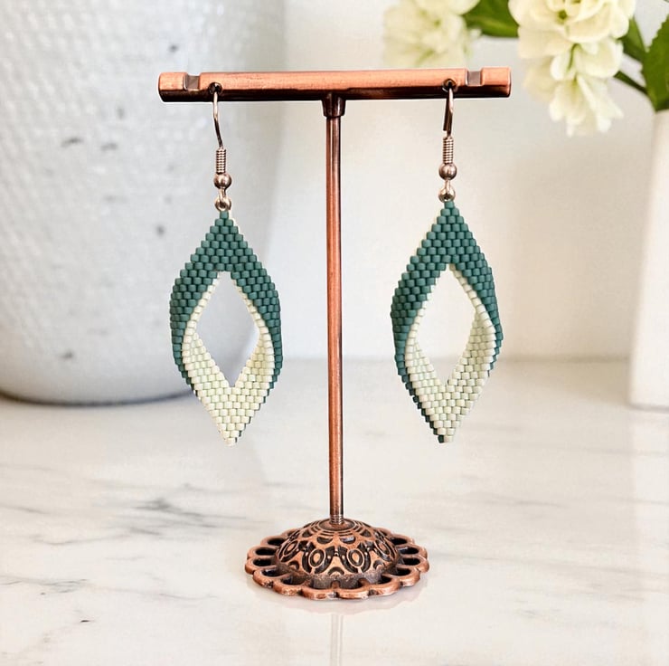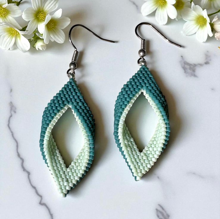 Very intricate, hand stitched beaded earrings made with over 500 tiny Japanese in a deep green and gorgeous pearlescent mint glass beads! Completed with silver surgical steel ear wires and complete with a small rubber back included to stop the earring falling out.