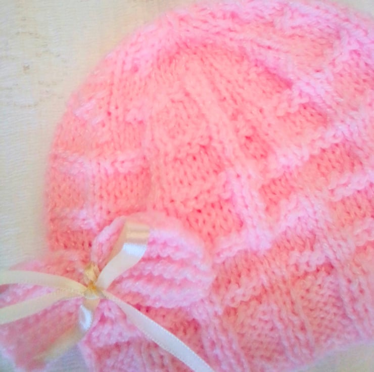 This cute hat with a knit and ribbon bow decoration and a subtle basketweave pattern would make an ideal gift for a birthday, baby shower, new baby or just as something to keep your little ones warm on a chilly day. It is not currently in stock but it can be custom made for you in a size and colour of your choice, just let me know your requirements. Please allow 1 - 2 weeks processing time to make it and post out to you. The available sizes and prices are shown below and please state colour required when you order.