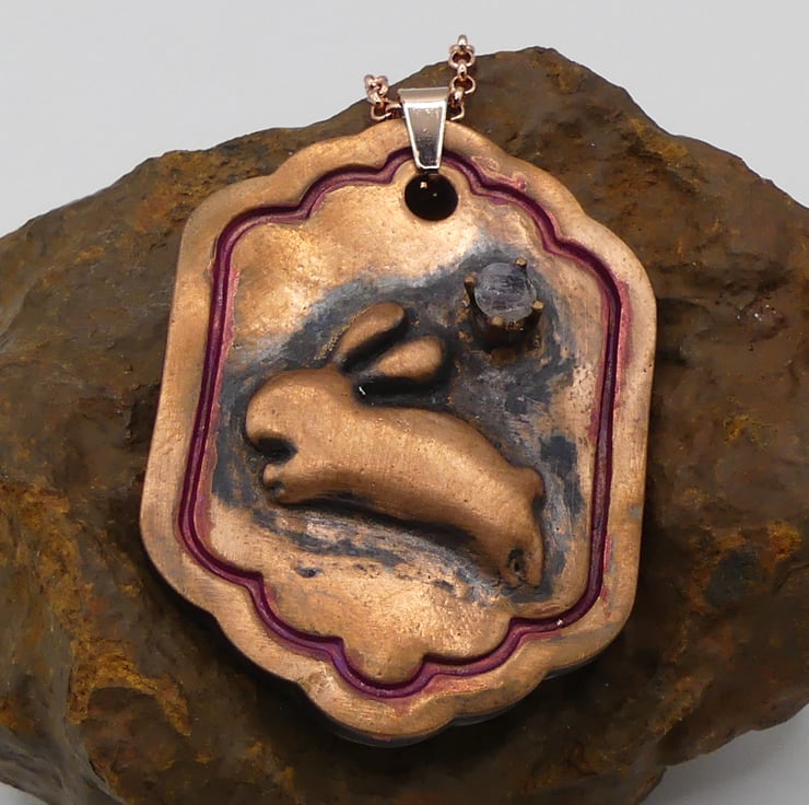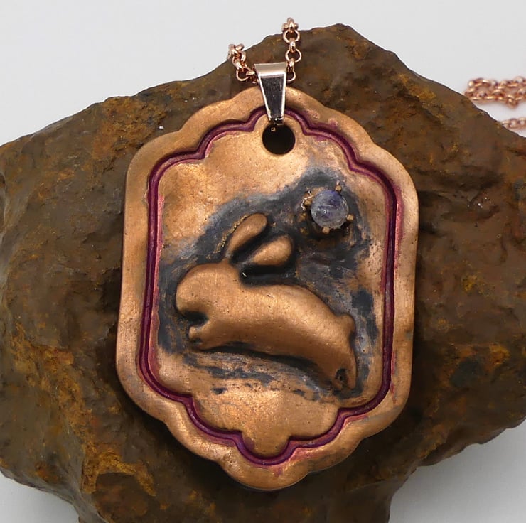 Recycled Copper Leaping Bunny on Frame Pendant Necklace with Rainbow Moonstone.