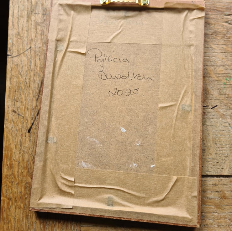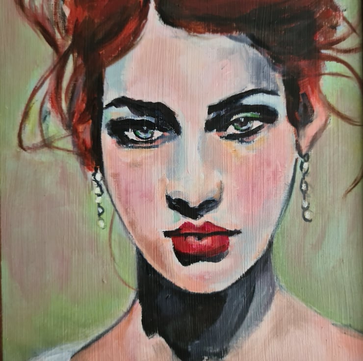 Measuring 7.5 inches in height and 5.5 inches in length, this painting showcases a contemporary portrait theme, signed by myself