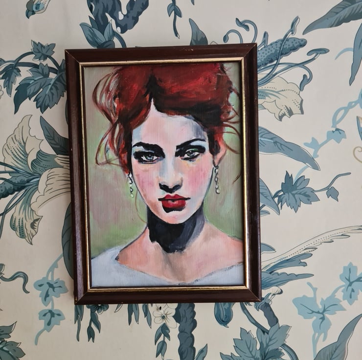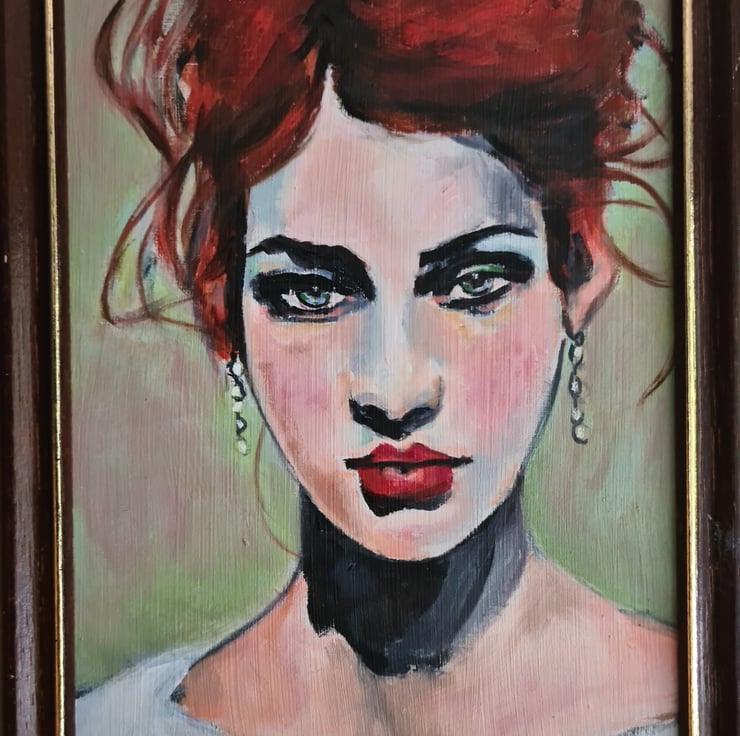 This is an original mixed media portrait created by myself using oil paint on board , framed in a preloved frame