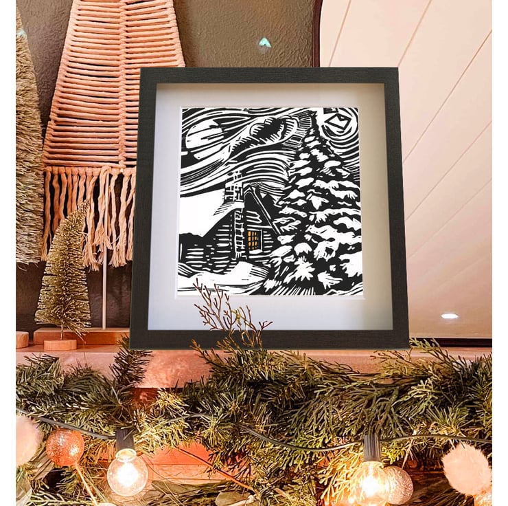 A lino-cut print of a log cabin in a snowy landscape. Christmas letters can be seen swirling in the wind on their way to Santa.