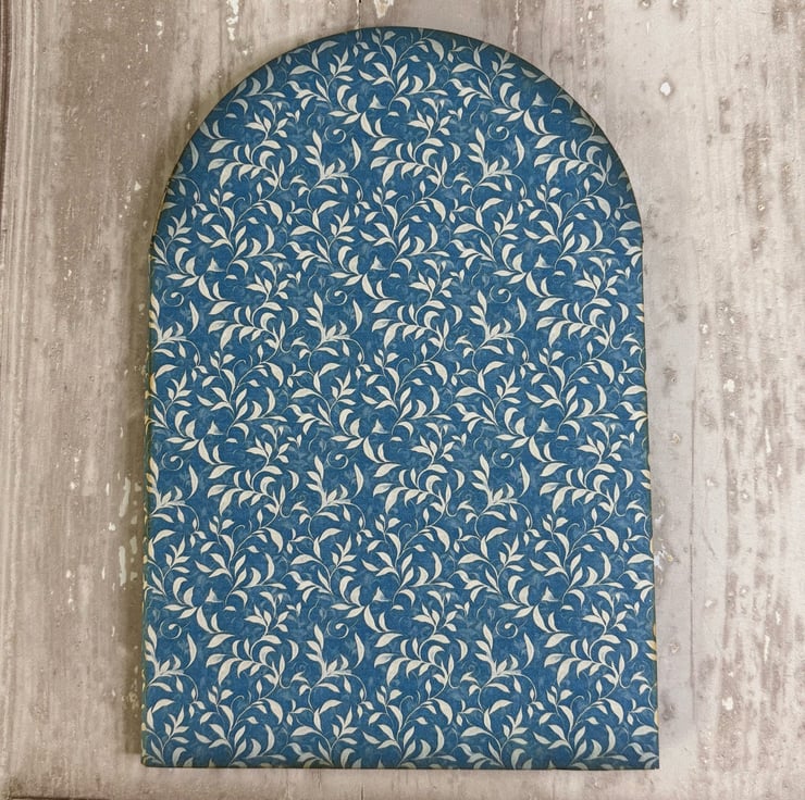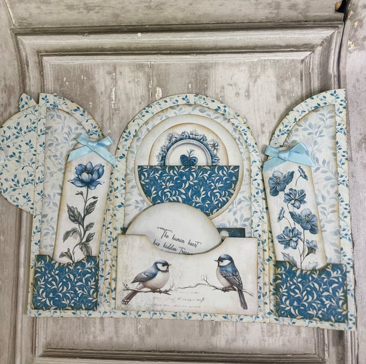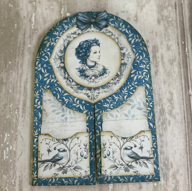 Blue Lady and Bird Folio print toppers and pockets, mounted onto a pretty blue leaf surf design. The front closure is by hook and loop spot, behind the cameo. 2 pockets on the front covers hold 2 small tags. Opens to reveal 4 pockets, 2 on the back of the doors with slim tags and blue ribbon. 2 tags in the centre pocket and a round page in the half circle at the top. Measures 4.5" x 6.5"