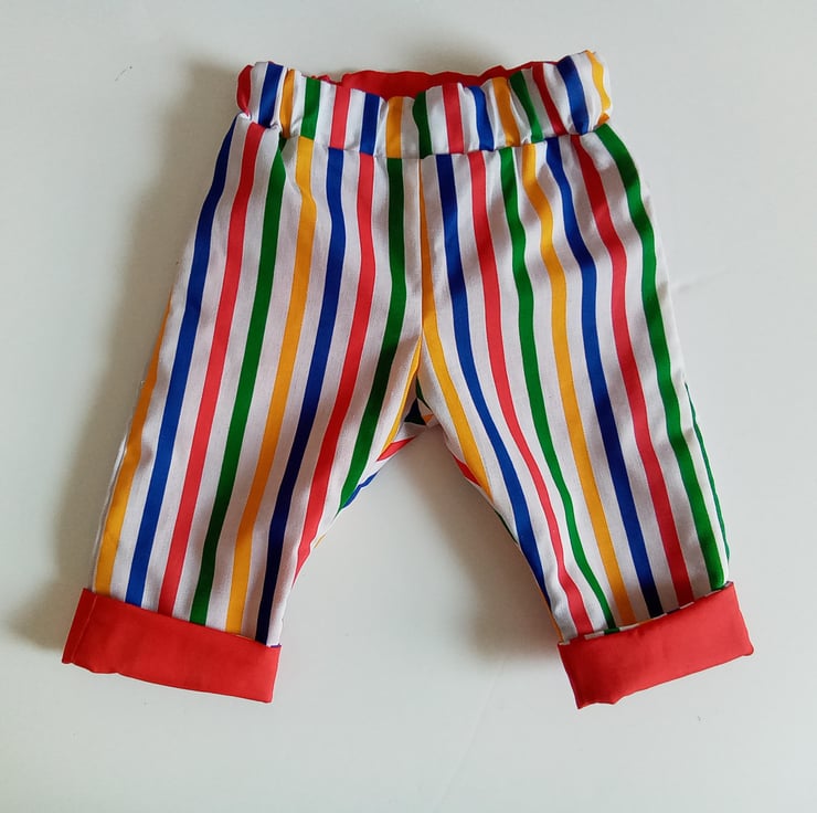 Summer Trousers for age approx 3-6 months. These are made with a brightly striped polycotton fabric with a plain red reverse.