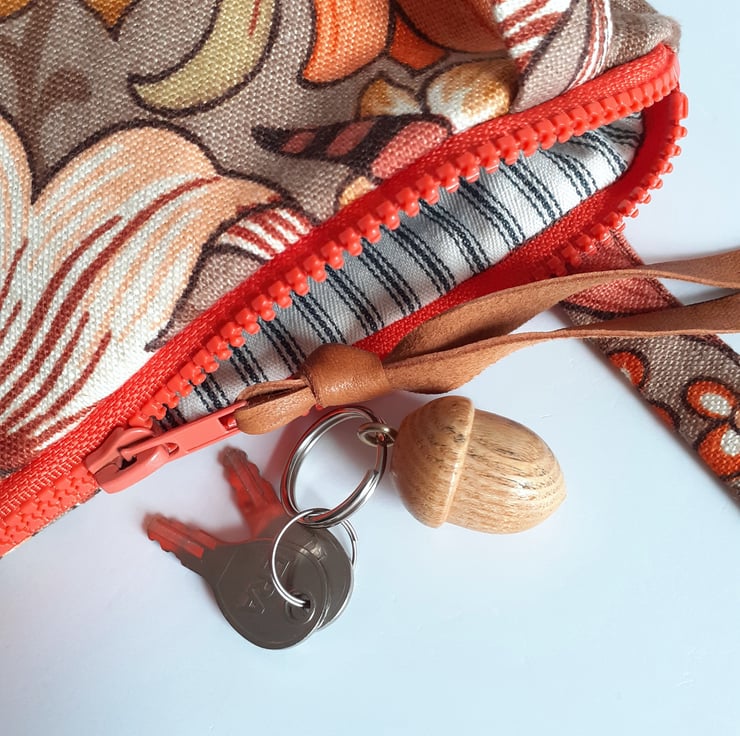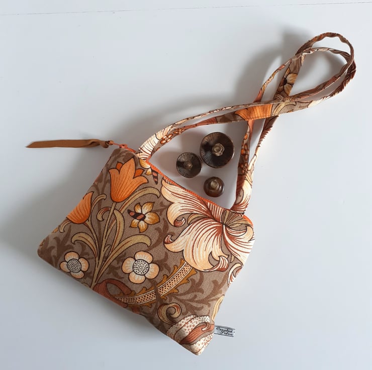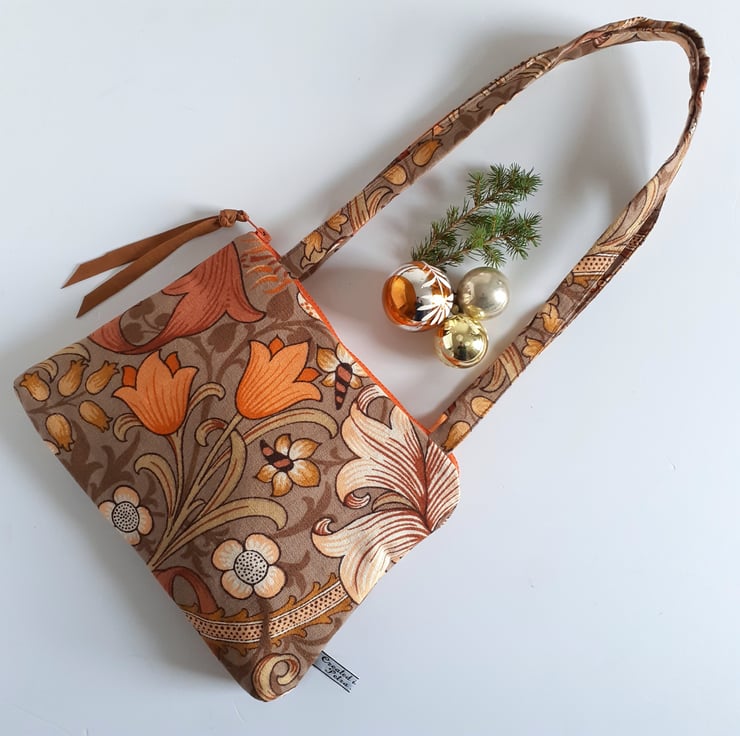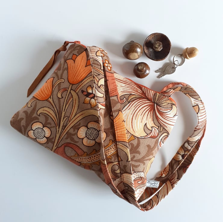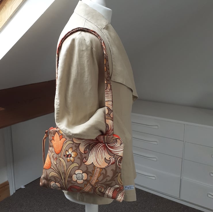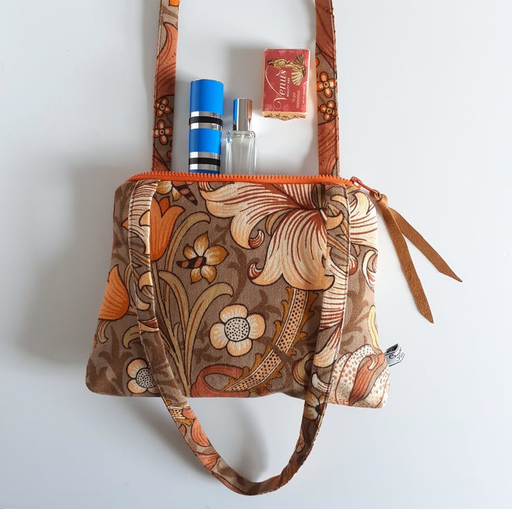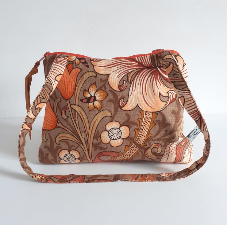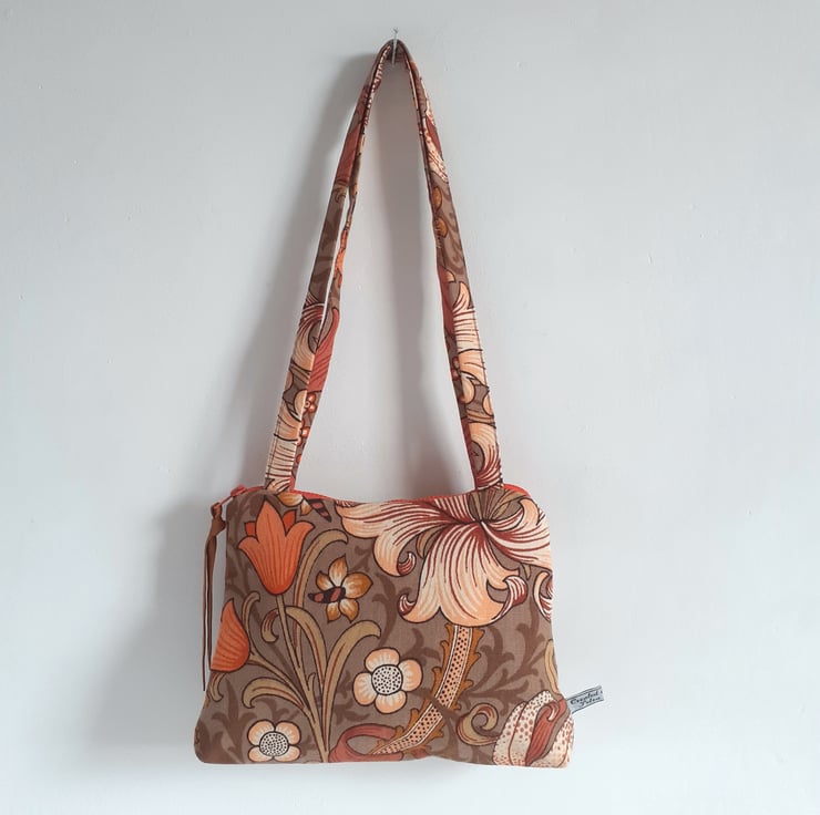 This shoulder bag or handbag with its chunky zip, is upcycled from a classic vintage Morris and Co fabric called Golden Lily. Its surface is climbing with lilies, leaves and tendrils in the warm autumn colours of rust, peach and brown.