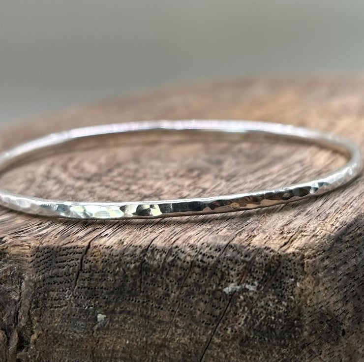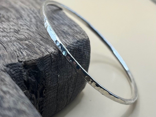 Thick 2.5mm bangle, sterling silver material, hammered and polished to finish.