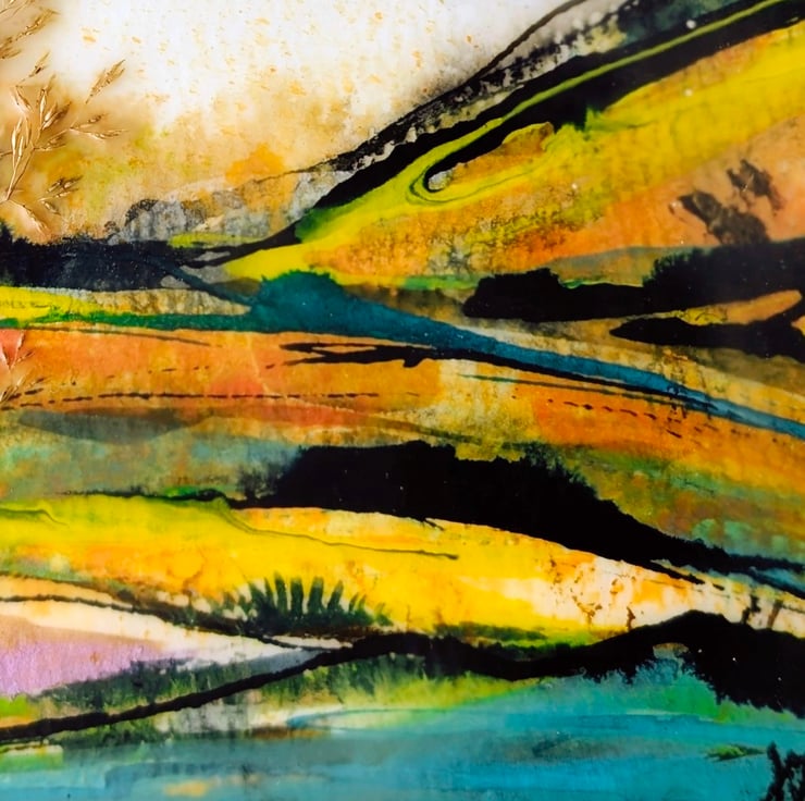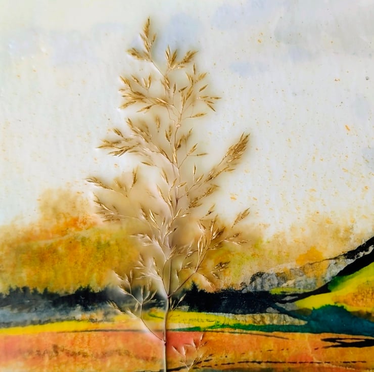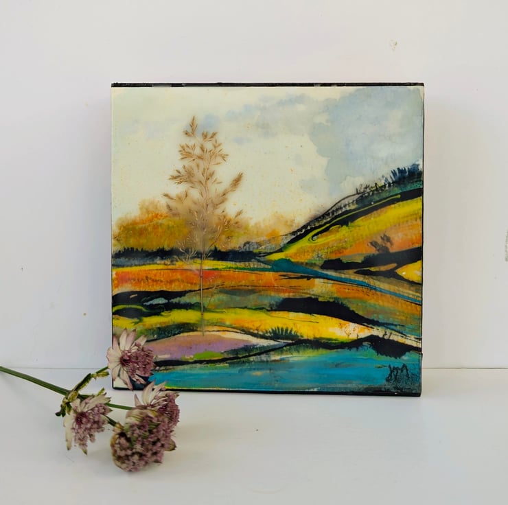 "Forever Autumn is a mini mixed media piece, created using acrylic inks, folliage from my garden and coated in encaustic wax.