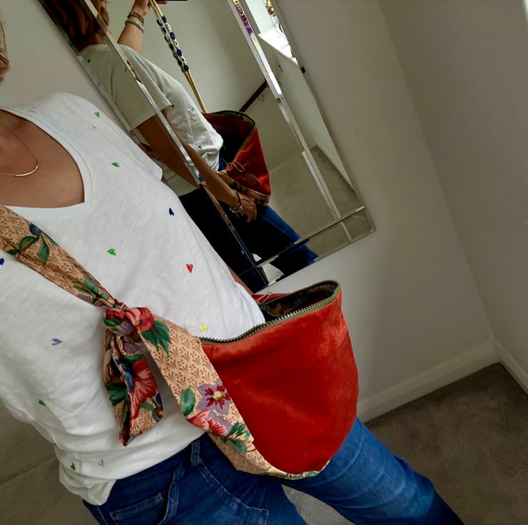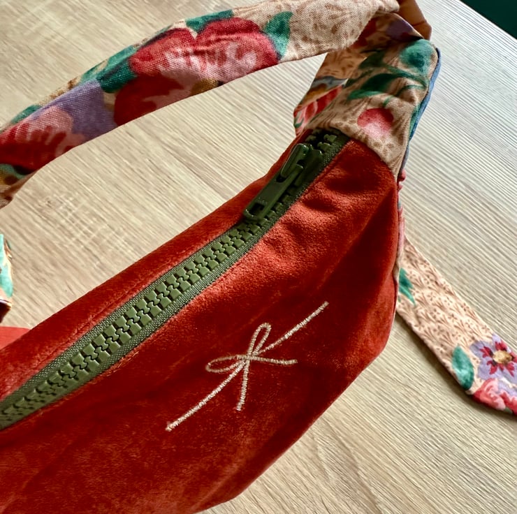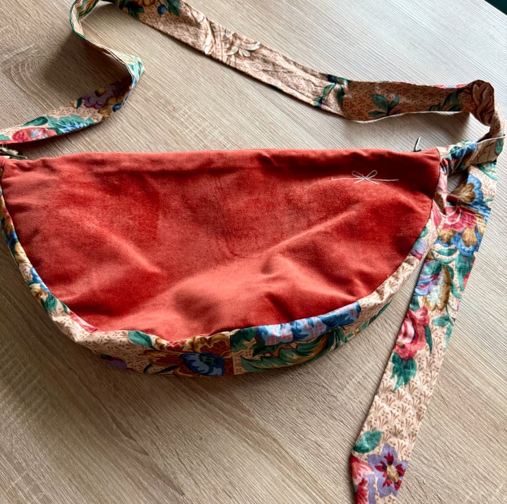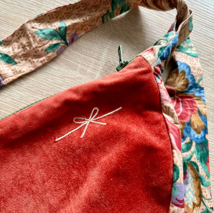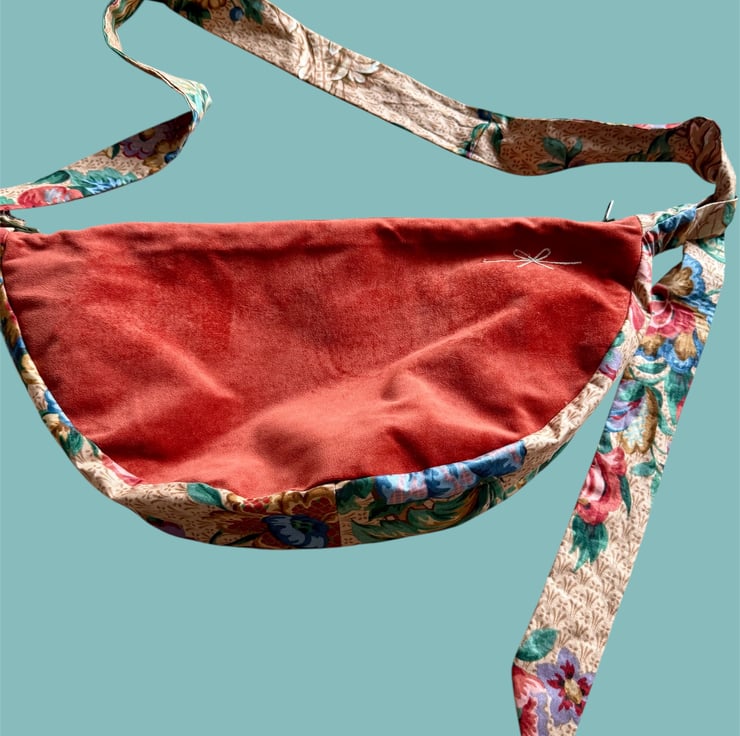 The starting point for this bag was a collection of secondhand fabrics I found in a charity shop. I was immediately drawn to the plush, velvet-like material in that rich, warm terracotta color, and the antique floral tapestry. I saw how the deep, cozy tone of the main fabric and the whimsical, blooming garden on the strap could complement each other, creating a piece that feels both luxurious and delightfully unique.
