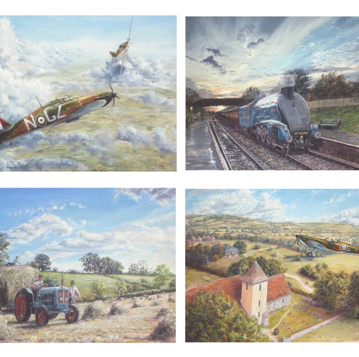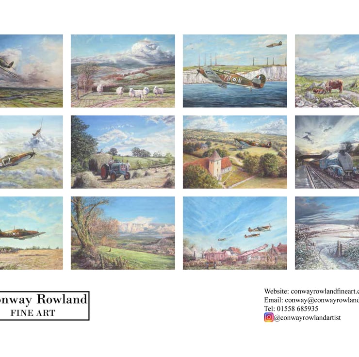 The calendar is roughly a 50/50 mix of some of my rural artwork and my commemorative Battle of Britain aviation paintings ... with a steam railway piece too!
