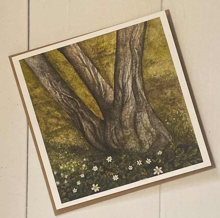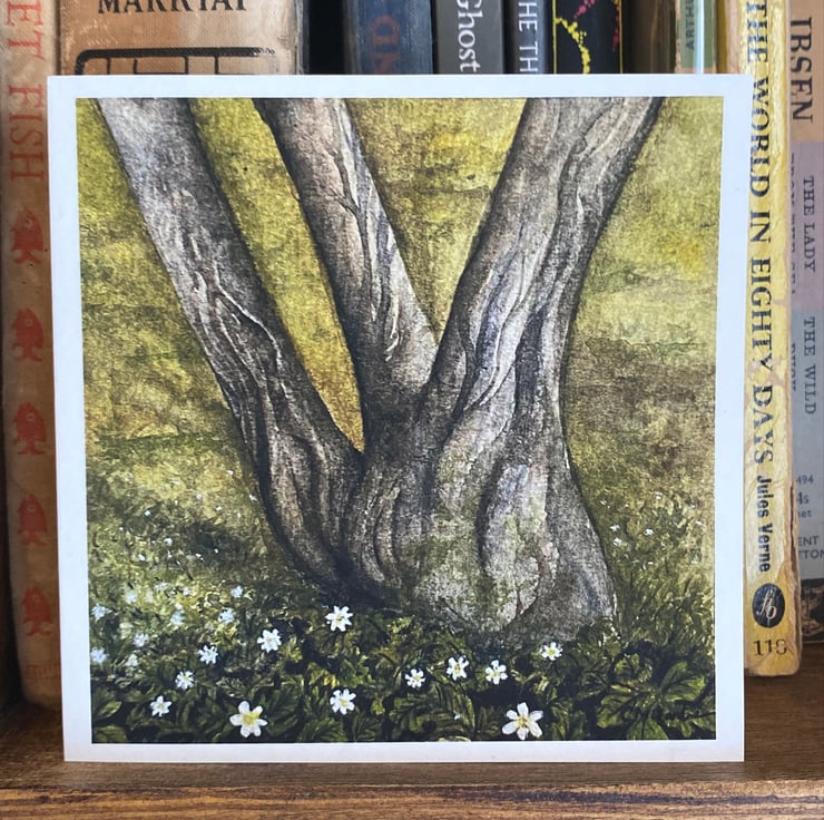 A detailed and quirky watercolour of the woodland anemones surrounding a hornbeam tree, painted by Charlotte M Gardner. Inspired by the ancient Langley Woods in Sandridge, famed for it's wild flowers including anemones and bluebells that surround twisting hornbeam trees. The card is blank inside, so can be used for multiple purposes. Perfect for special occasions or simply to write a letter or thank you note.