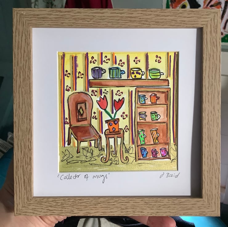 This little picture is an original pen and paint illustration. I have called it ‘Collector of Mugs.’ It is mounted and framed in light wood. The measurements of the frame are 7x7 inches. The drawing measures 4x4 inches.