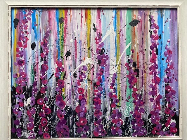 Purple Shock is a vivid representation of wild flowers growing on a forest floor reaching up to try and see the sunlight at the top of the forest canopy. Actual picture size is 35.5CM (width) and 28CM (height) set in a frame with an overall total size of 44CM (width) and 36.5CM (height). The picture is framed as seen in the photos and is ready to hang