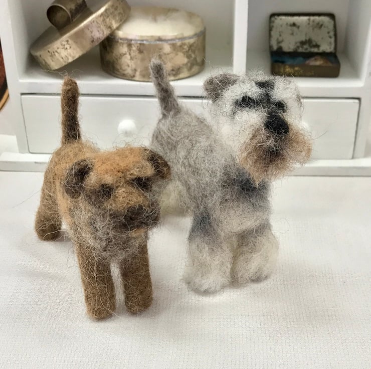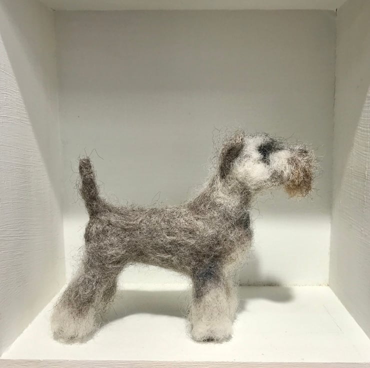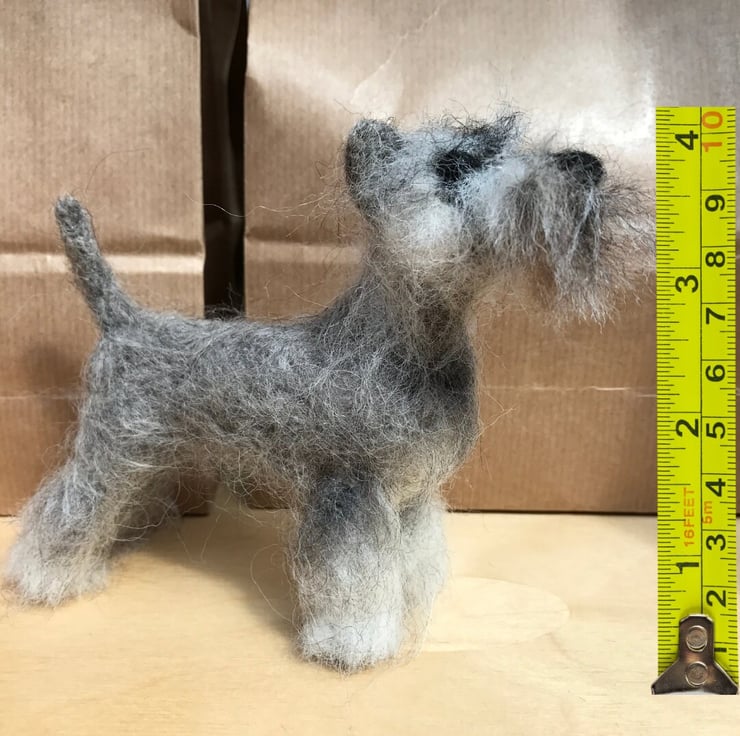 Each Schnauzer needle felt kits contain everything you need to make a small woollen dog: wool fleece, needle felting tools, needle and thread and beads for eyes, sponge plus full written instructions with diagrams. On average, the size from the head to toe is about 10cm.