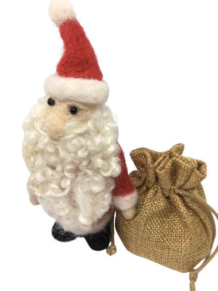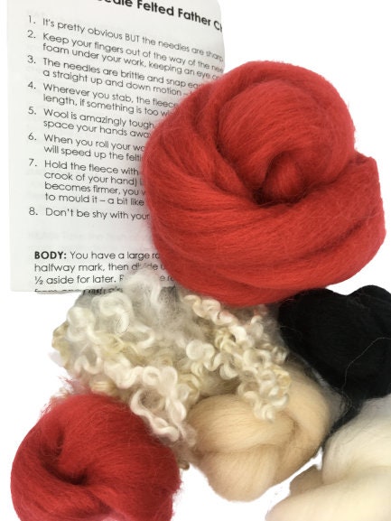 This needle felt kits contains everything you need to make a small woollen Father Christmas approximately 15cm high: wool fleece, needle felting tools, needle and thread and beads for eyes, sponge plus full written instructions with diagrams.