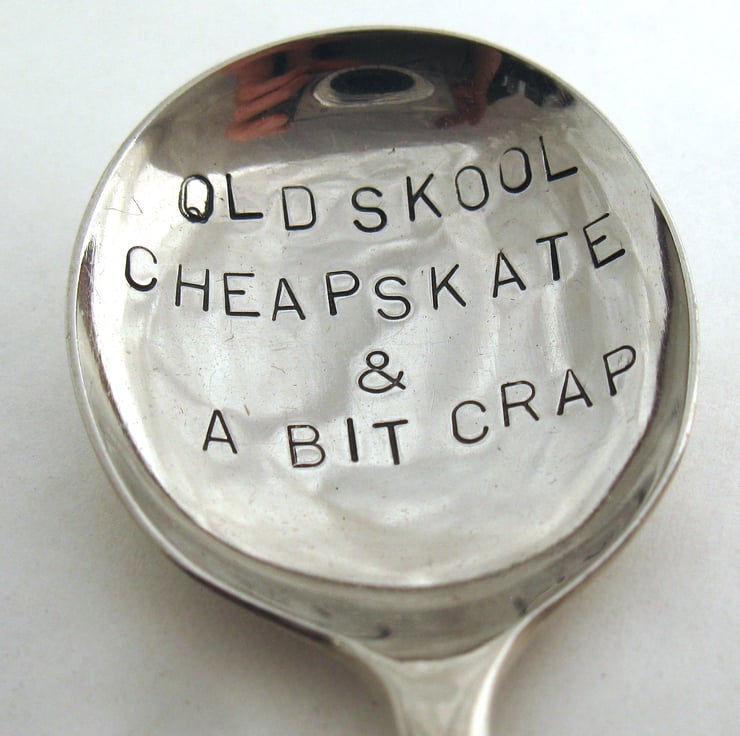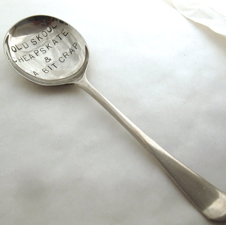 A vintage nickel silver spoon with a round bowl and a short handle, ideal for ice cream or cereal. I've hand stamped it with OLD SKOOL CHEAPSKATE & A BIT CRAP - the last phrase was added because I made a booboo and stamped a Q as the very first letter by mistake. I then tried overstamping it with the correct O and just made it look worse. But not being one to waste a spoon I carried on regardless in hopes that it might make someone else smile too. So here it is in all its slightly crap glory, consigned to the bargain bin where everything's been a fiver since I opened the shop and will continue to be a fiver until the cost of a postage stamp outstrips it. Also, I always combine all the postage no matter how many bargains fall into your basket. Just saying.