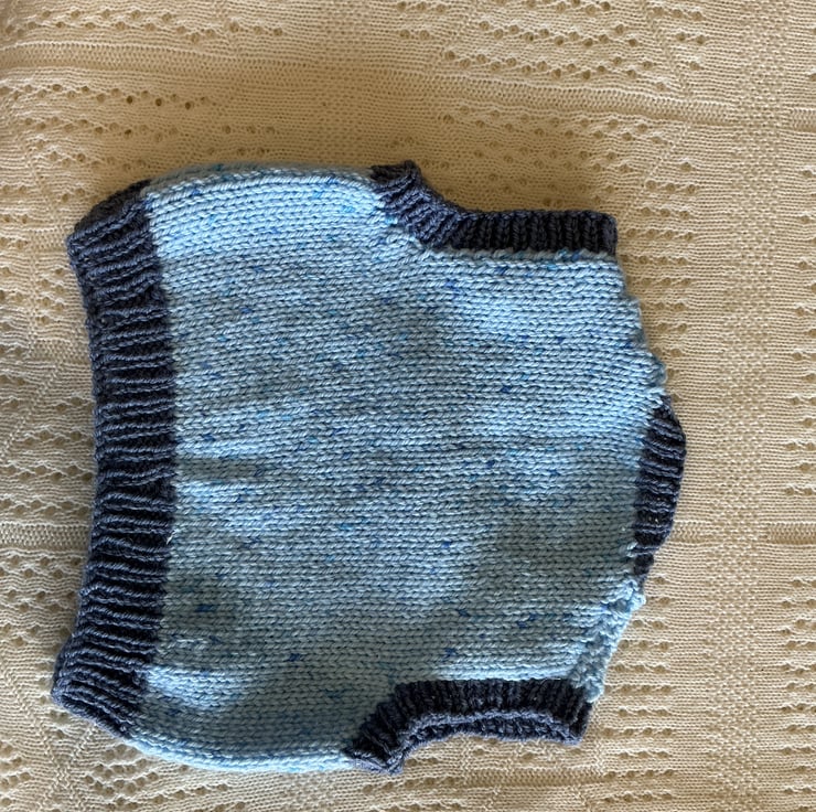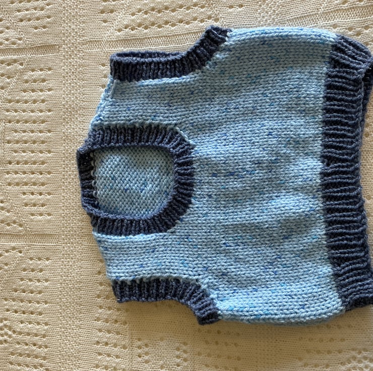 Two tone blue double knit baby pullover, sleeveless with contrast round neck, arm borders and bottom border done in rib. Length neck to waist 10 inches, chest (armhole to armhole) 10.5 inches