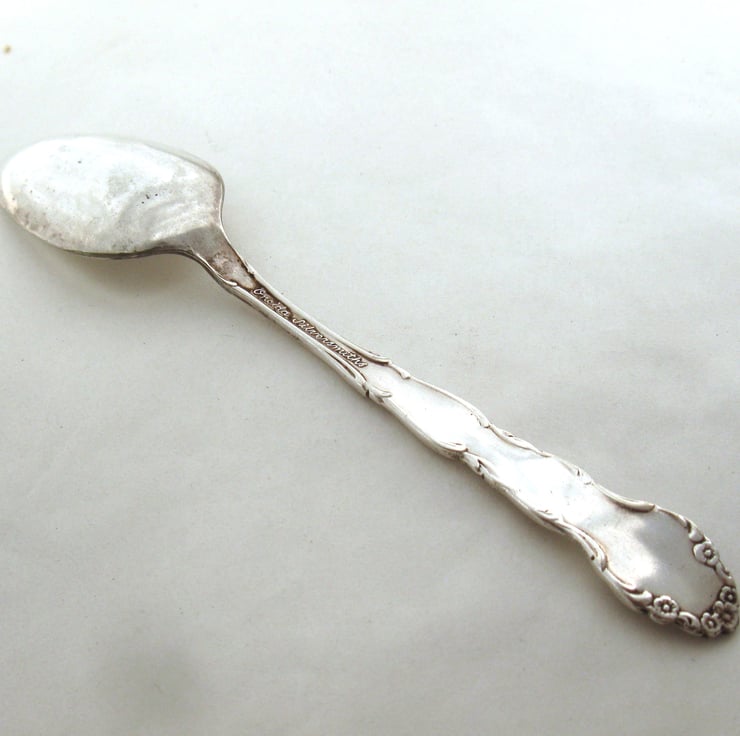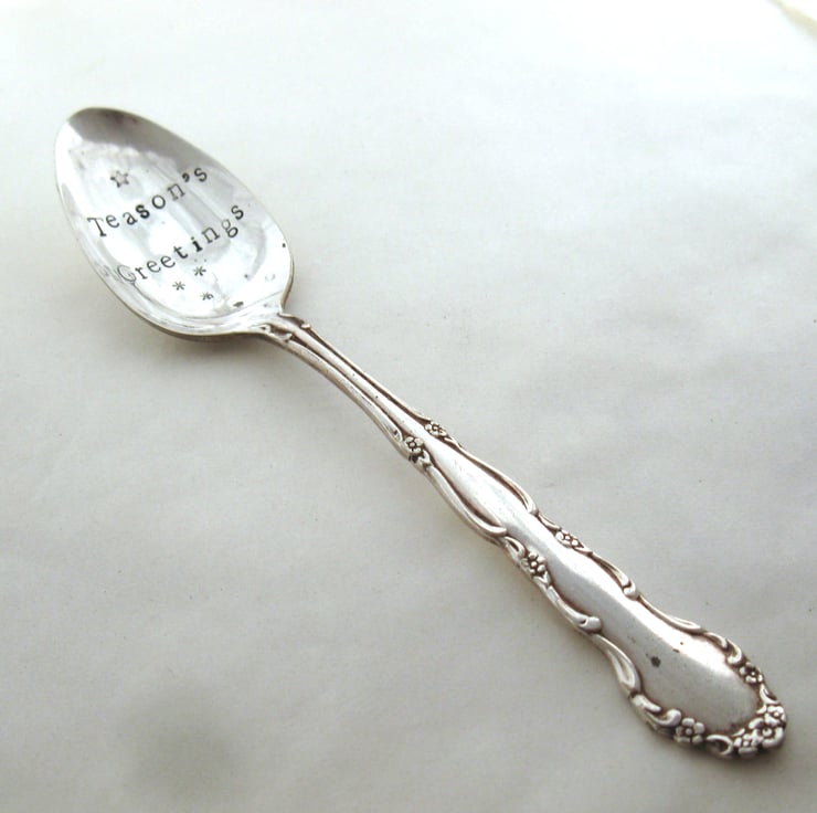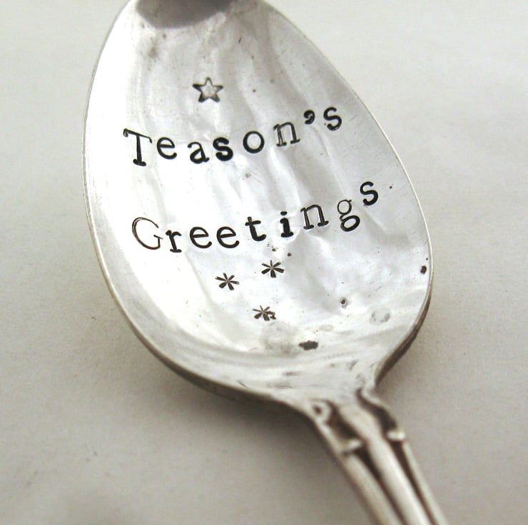 A vintage teaspoon with the words 'Teason's Greetings' hand stamped in the bowl along with a star and a few 'snowflakes'( well OK they're asterisks really, but don't look too closely). It's a silverplated spoon approx. 13cm long and has a floral handle. The handstamped wording is coloured black with water-based acrylic paint. Hand wash with care.