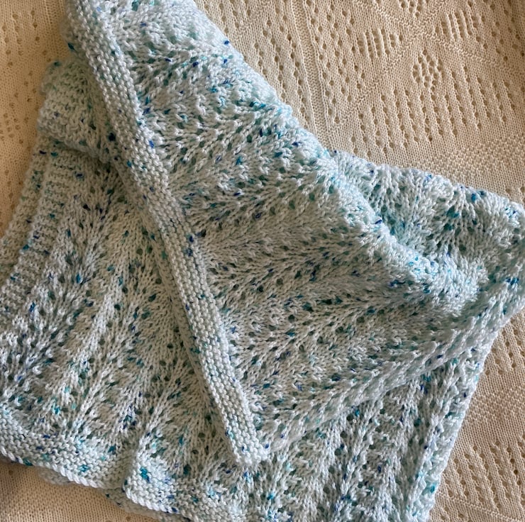 Double knit baby blanket, with rib borders and fan pattern. 24 inches wide, 33 inches long. Machine washeable, wool cycle. Cool tumble dry.
