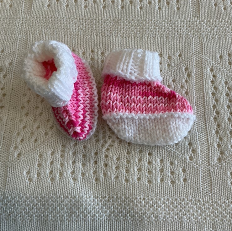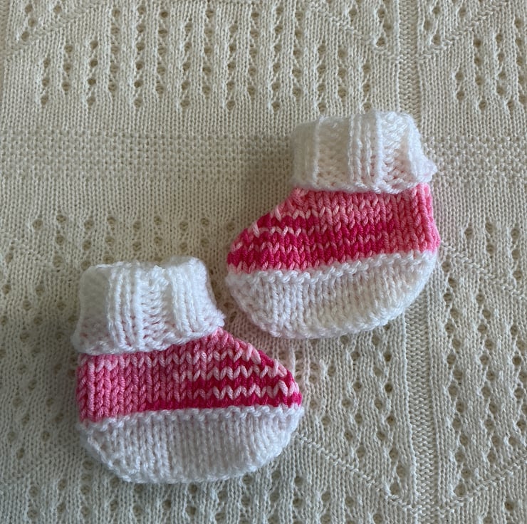 Rib top, white and mixed pink booted. Newborn to 3 months. Machine washable.