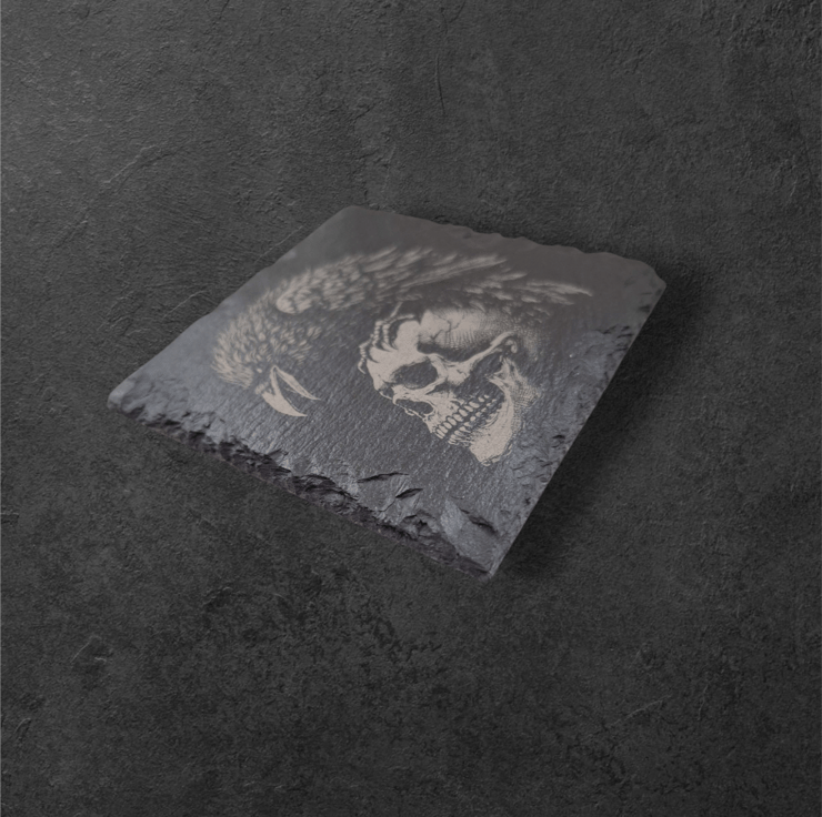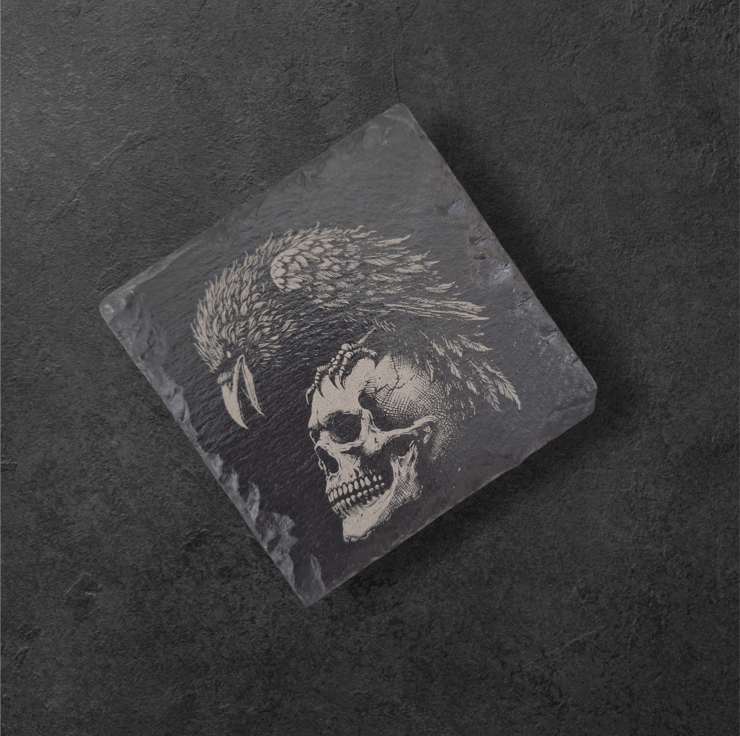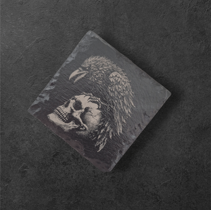 Add a touch of gothic elegance to your home with this handcrafted 10x10cm slate coaster featuring a striking skull and raven design. The high-contrast etching creates a dramatic, dark aesthetic - perfect for lovers of gothic art, alternative décor, or unique statement pieces.