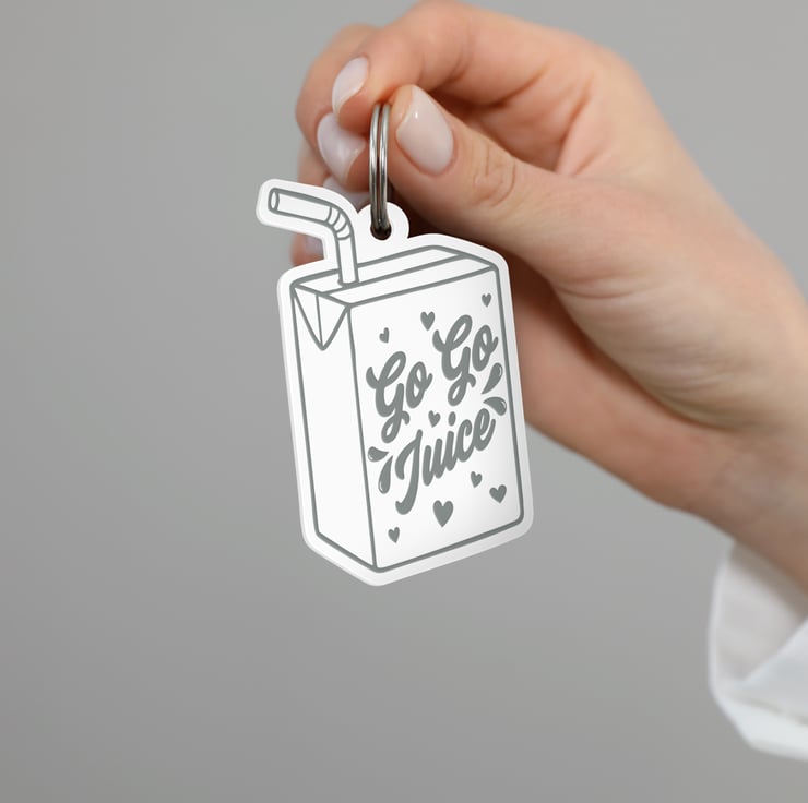 "Bring some playful nostalgia to your everyday accessories with this song-inspired motel-style keyring in a juice box design. With its heart details and bold retro lettering, it’s the perfect combination of fun and practical. Attach it to your keys, handbag, or backpack to carry a little personality wherever you go.