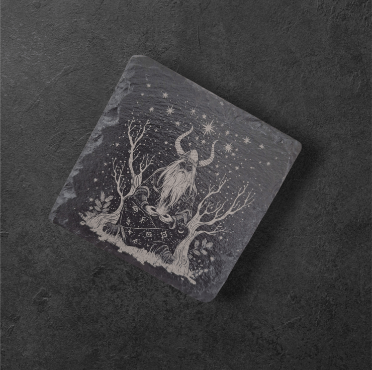 Handcrafted from natural slate, this 10x10cm coaster features a detailed etching of a horned Viking seer surrounded by stars and sacred trees—an evocative design inspired by Norse mythology, runes, and pagan traditions.