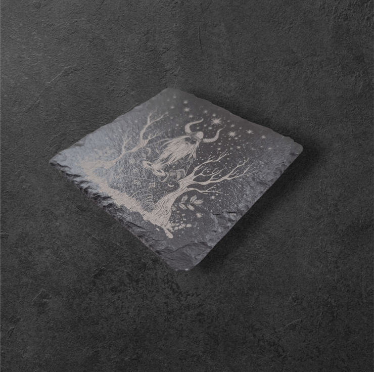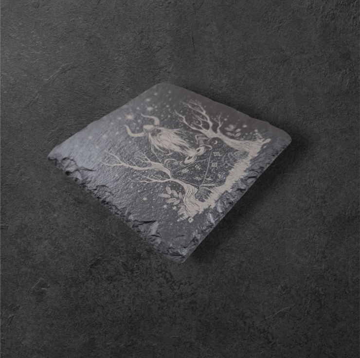 This coaster was inspired by the mysticism of Norse mythology and the imagery of the Viking seer (Volva) - wise figures who connected the human world with the divine. I wanted to capture the feeling of sitting under the stars in an ancient forest, guided by runes, spirits, and the wisdom of the old gods. The design brings together elements of cosmic symbolism, sacred trees, and ancestral knowledge, etched permanently into stone to reflect the timeless nature of these myths.