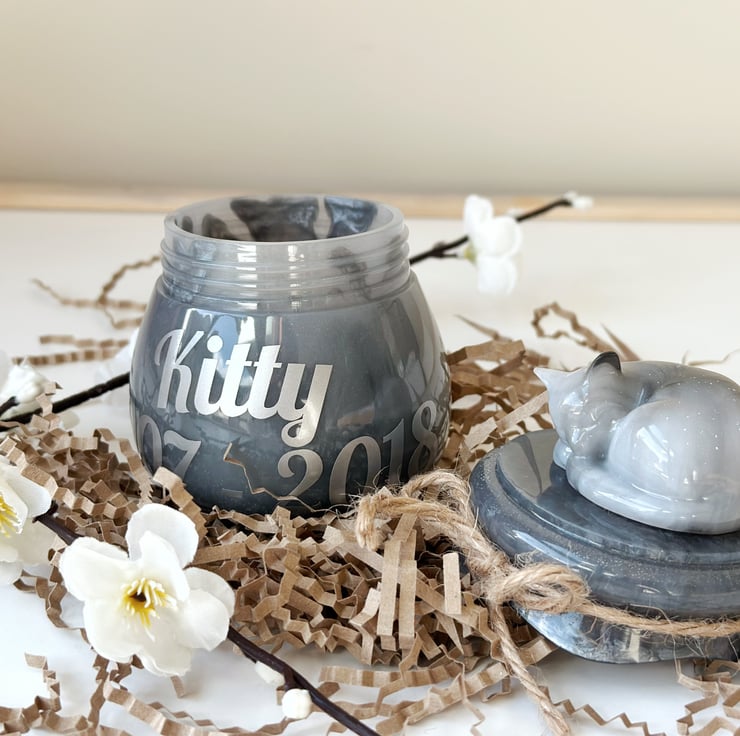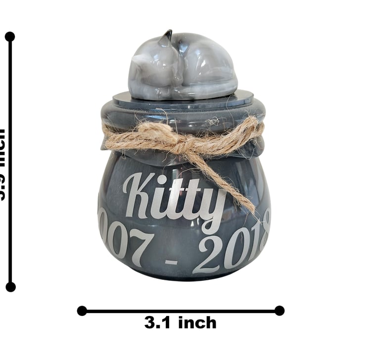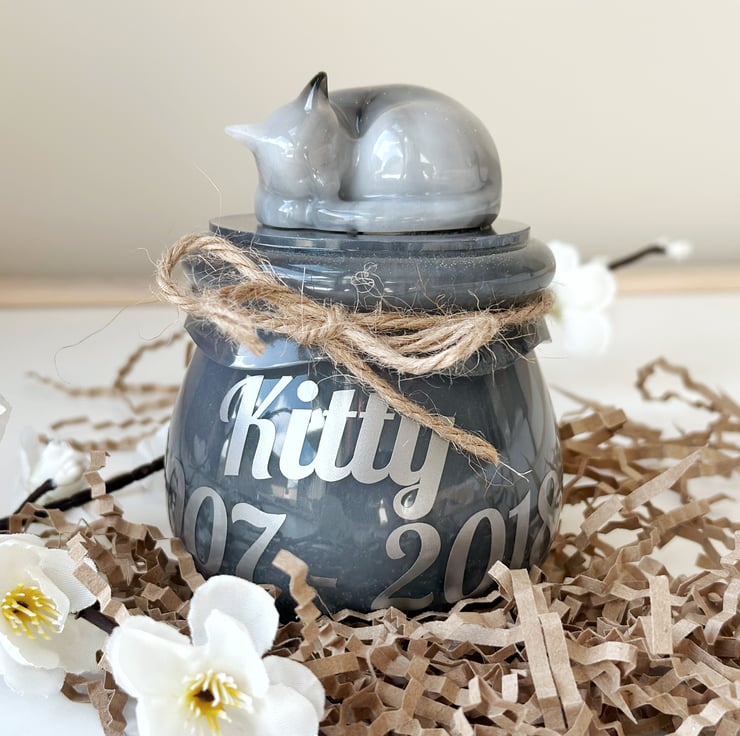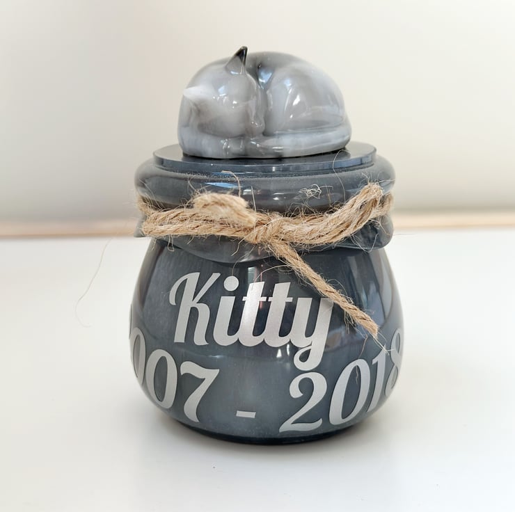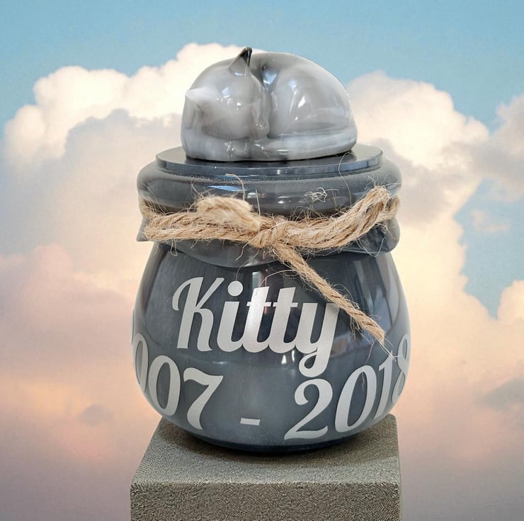 Each piece is unique, offering a comforting way to hold ashes, fur, or small keepsakes. The colour of both the jar and the cat figurine can be customised, making it a truly personal tribute.