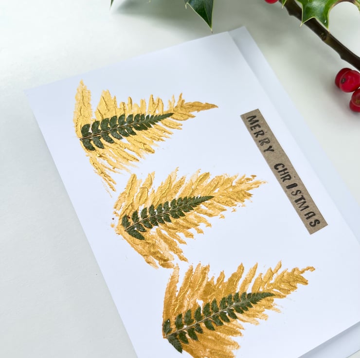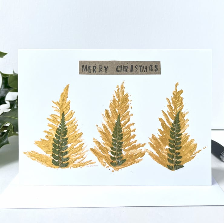 This lovingly handmade Christmas card is made using pressed ferns from our garden and hand painted gold Christmas trees.
