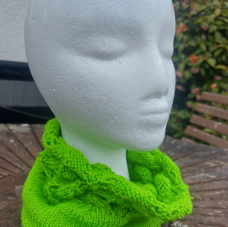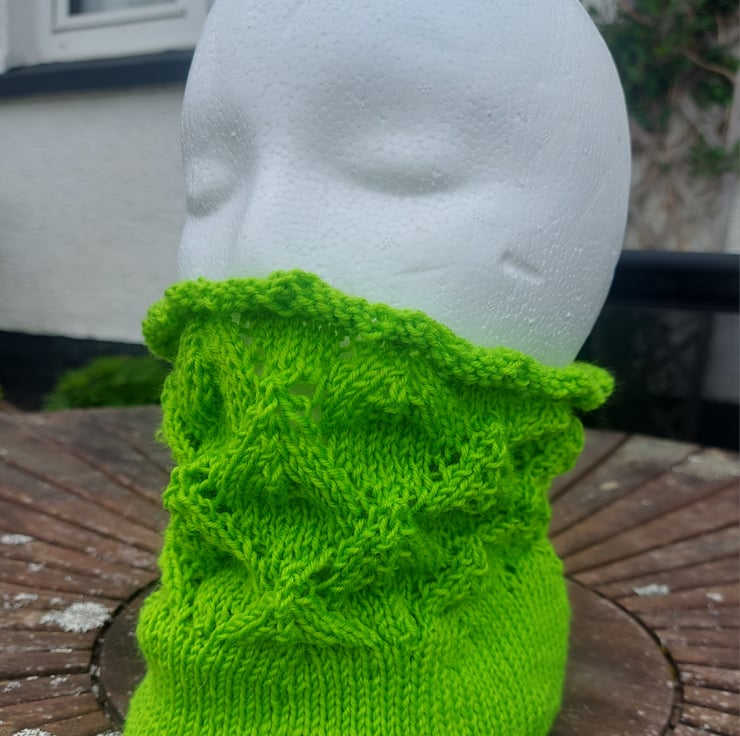 This feminine patterned cowl has a slouch style, edged with a picot border. It is one of a kind and would look beautiful under any jacket This sutumn or winter. Made in double knit weight yarn, so its not too bulky.