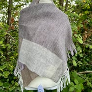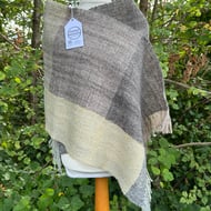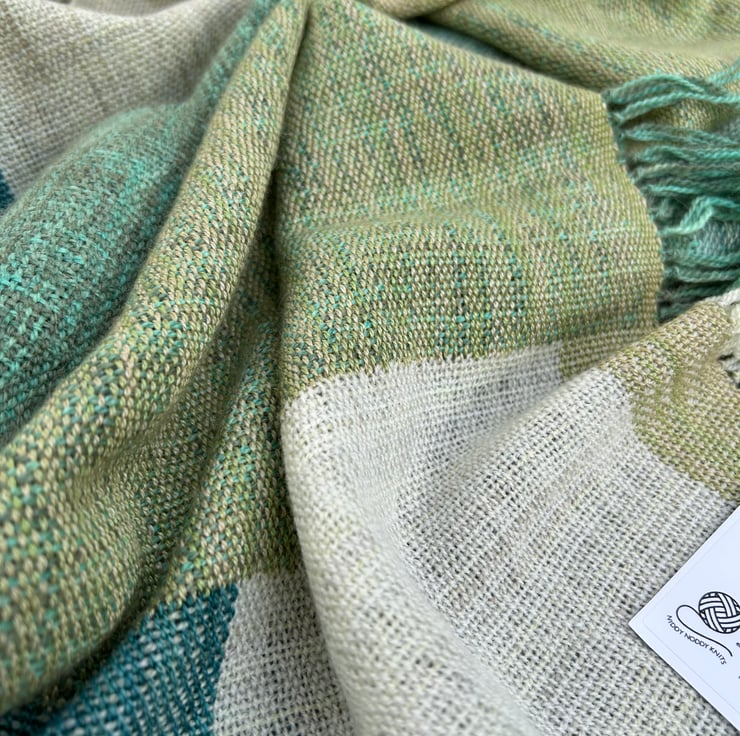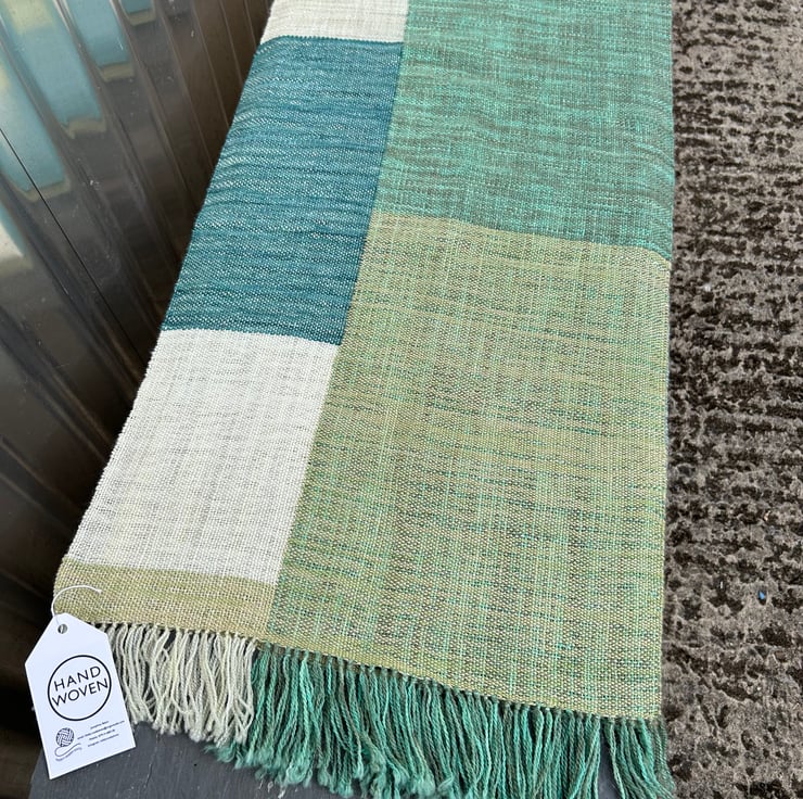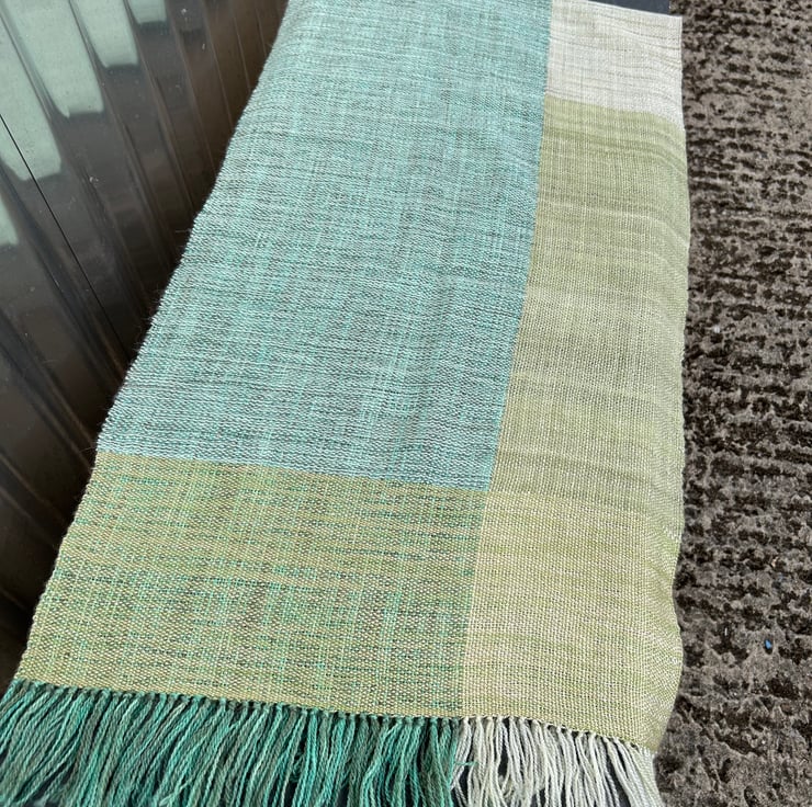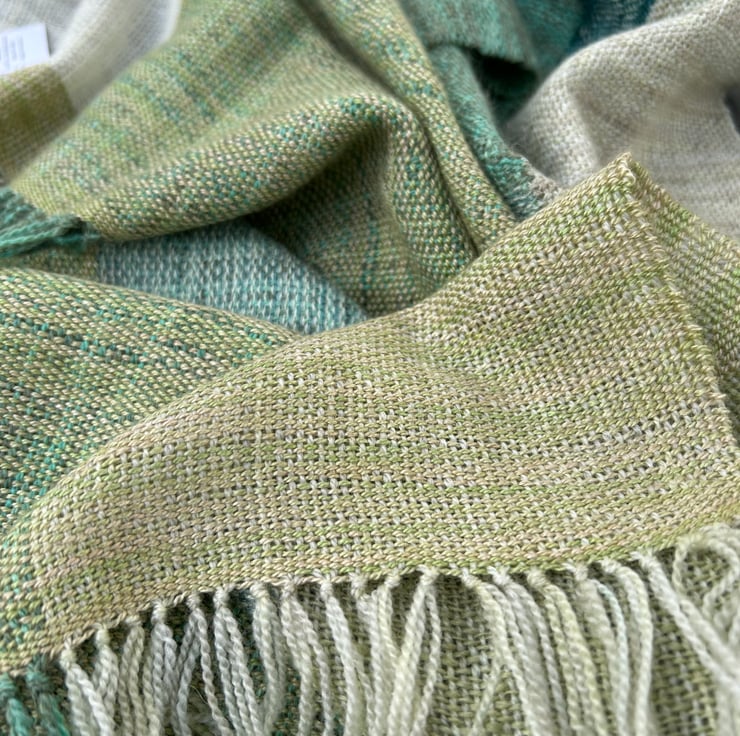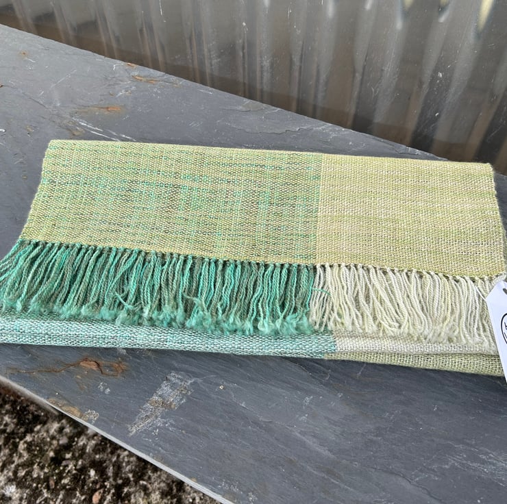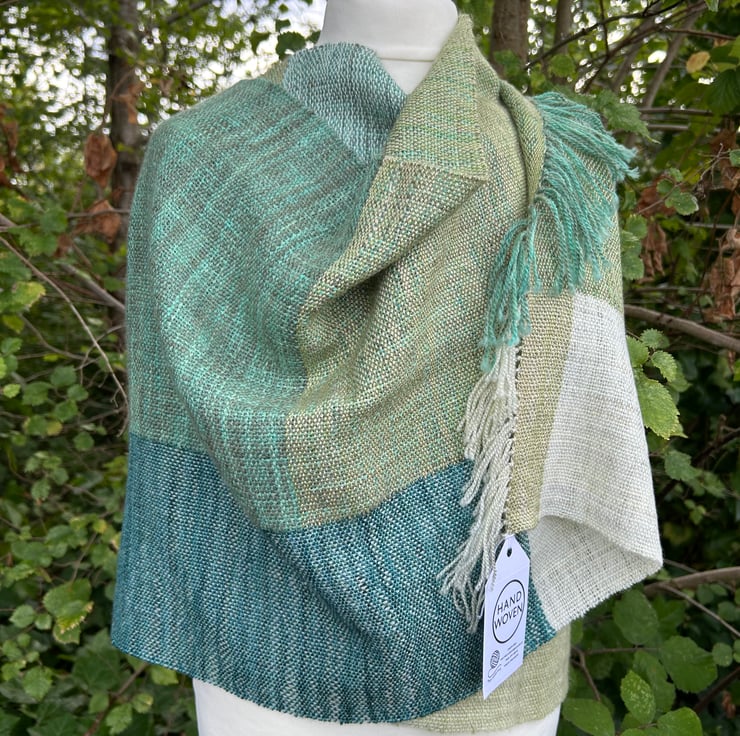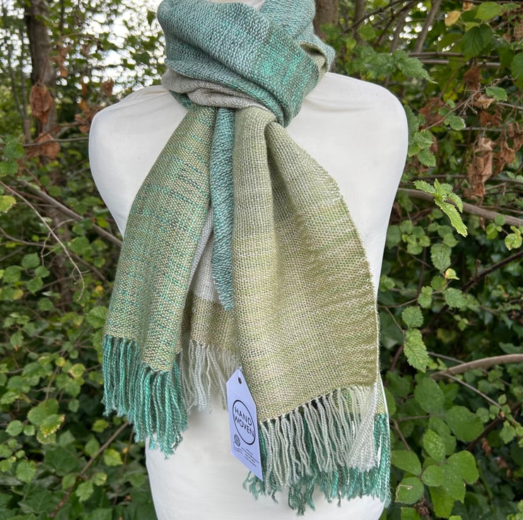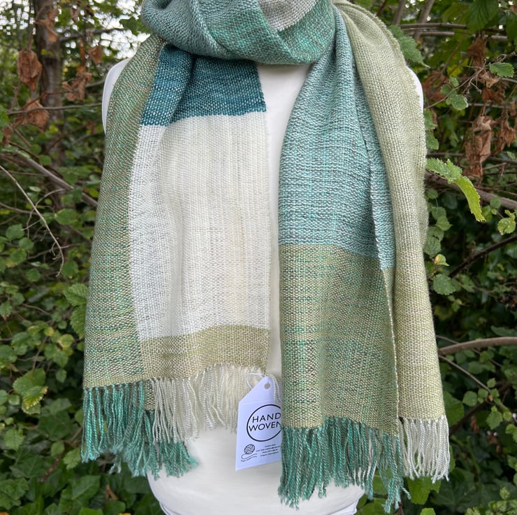 This beautiful silky soft scarf/shawl has been handwoven by me in my studio on a rigid heddle loom. Woven with luxurious artisan hand dyed yarns, I was inspired by a Japanese weaving studio to create blocks of colours in shades of green working intuitively on the loom to produce a one of a kind lightweight scarf/shawl. Fibres in the yarns include silk, baby camel, tencel, cashmere, baby alpaca, bamboo, merino and blue faced Leicester wool.