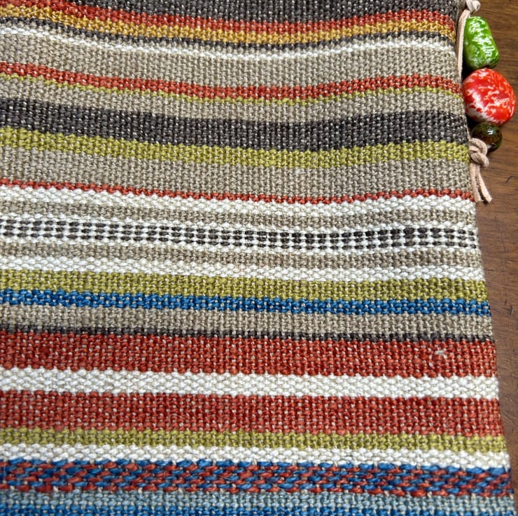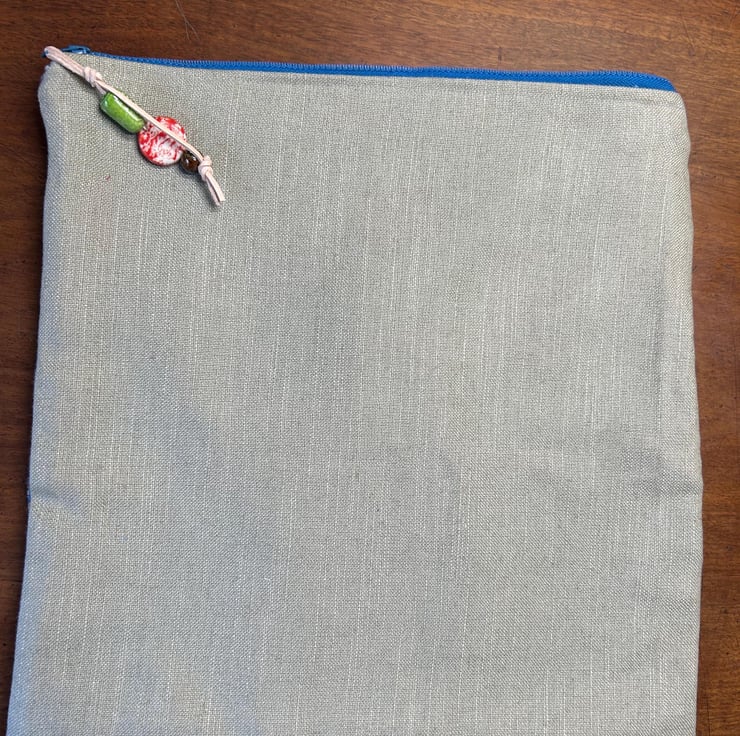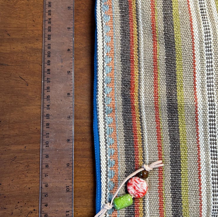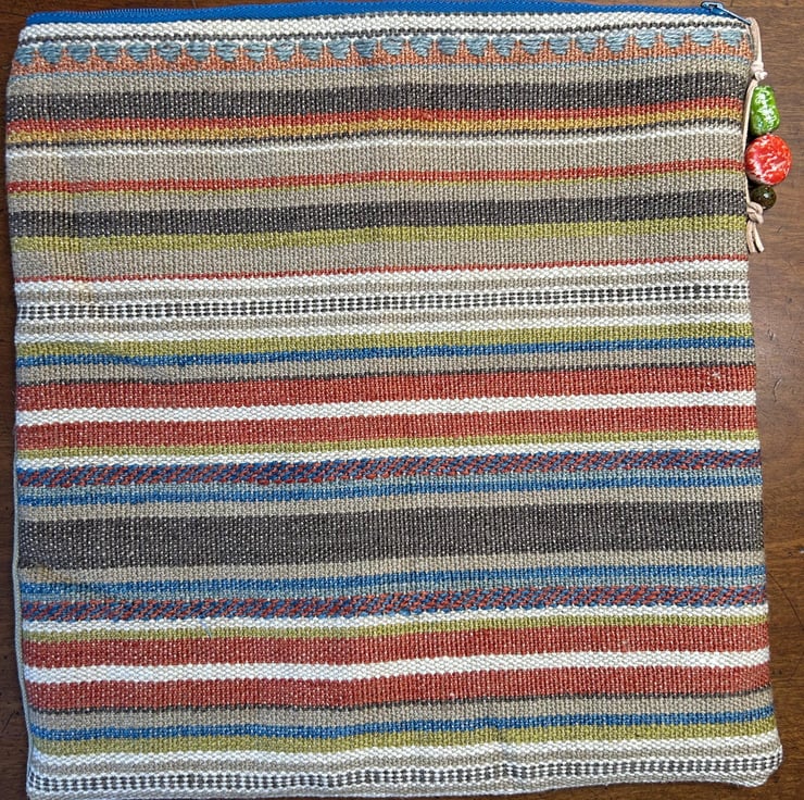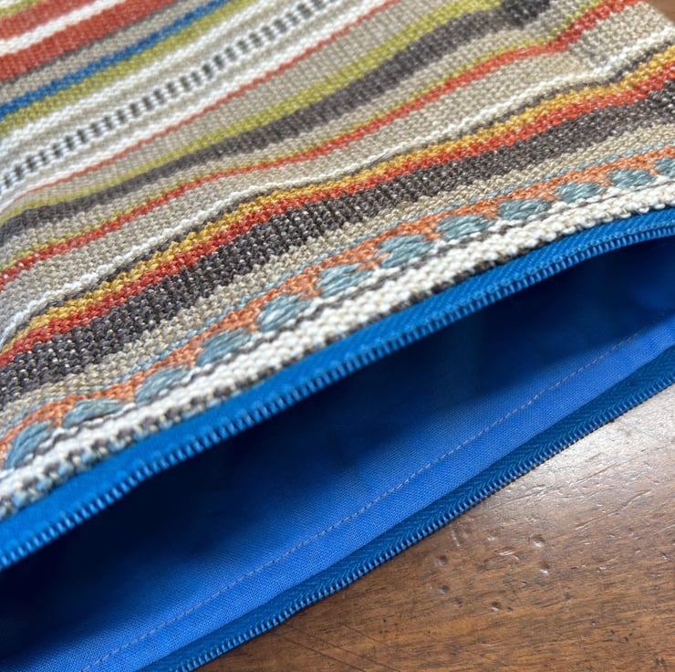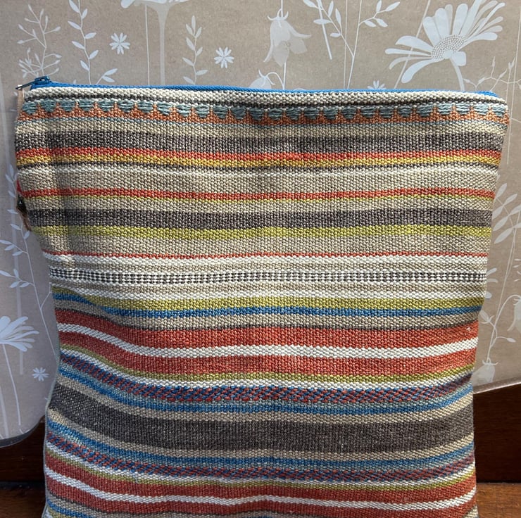Made from heavy weight woven, colourful fabric with a blue zipper and blue lining.