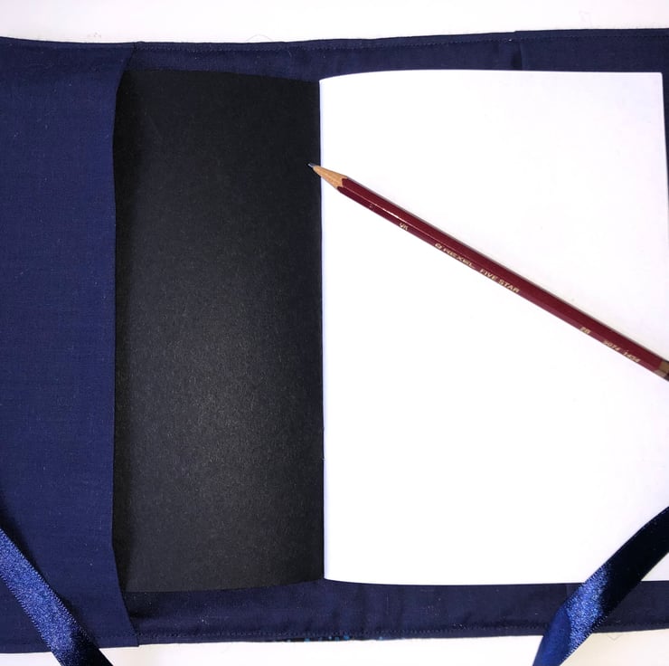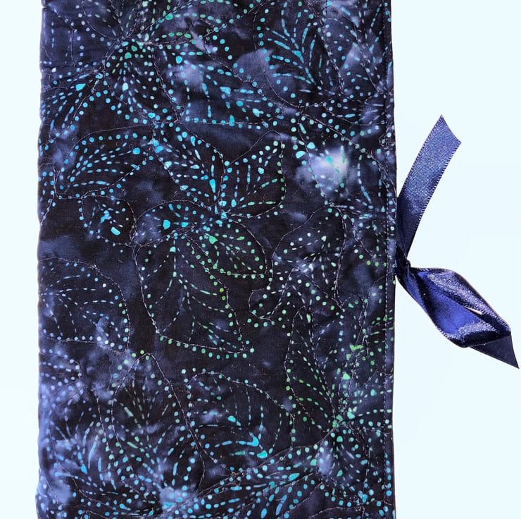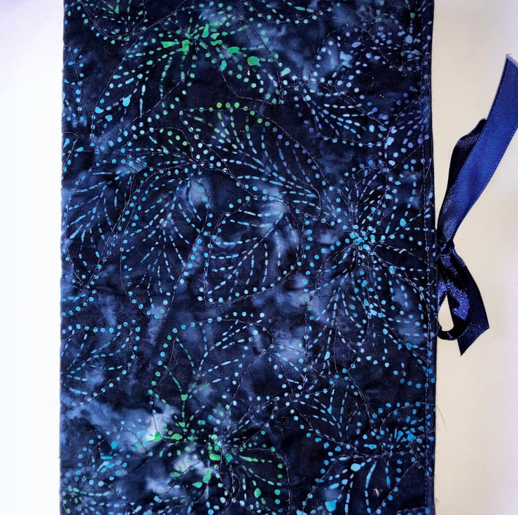 This is a lovely blue batik fabric A5 notebook/journal cover. The cover has been machine quilted making it very tactile. It is lined in a navy blue cotton with a blue ribbon tie.