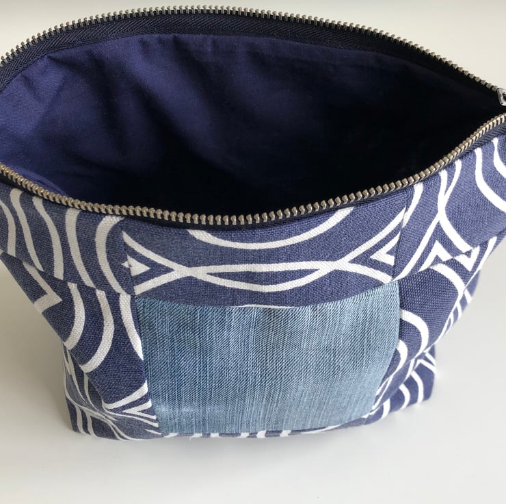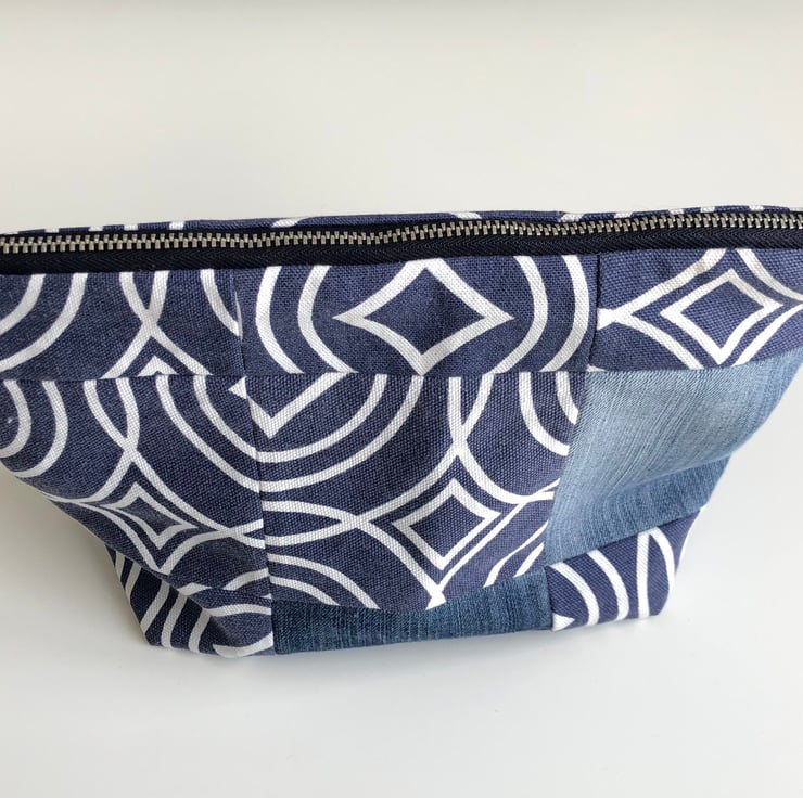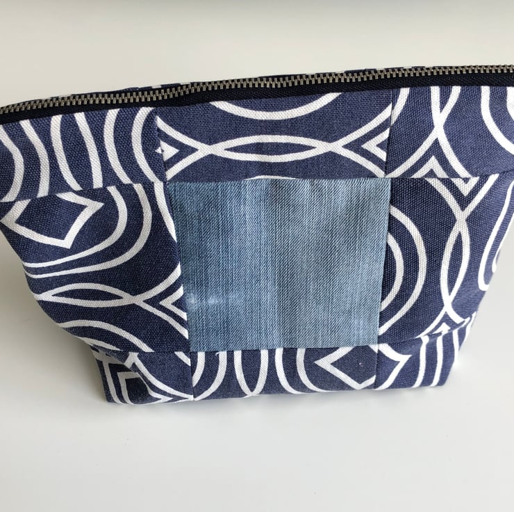A cute little blue patchwork zipped bag made from repurposed fabric. The bag is made from fabric from an old canvas cushion and jeans. It has a new matching navy blue lining and metal zip.