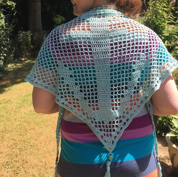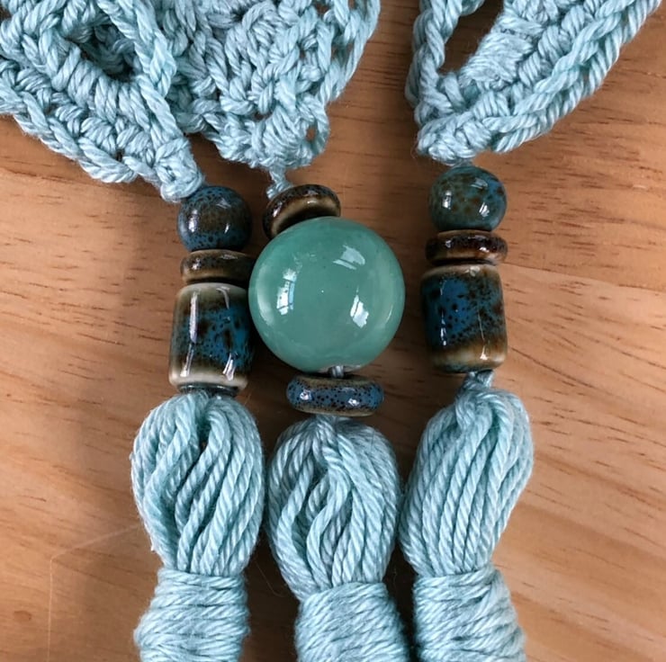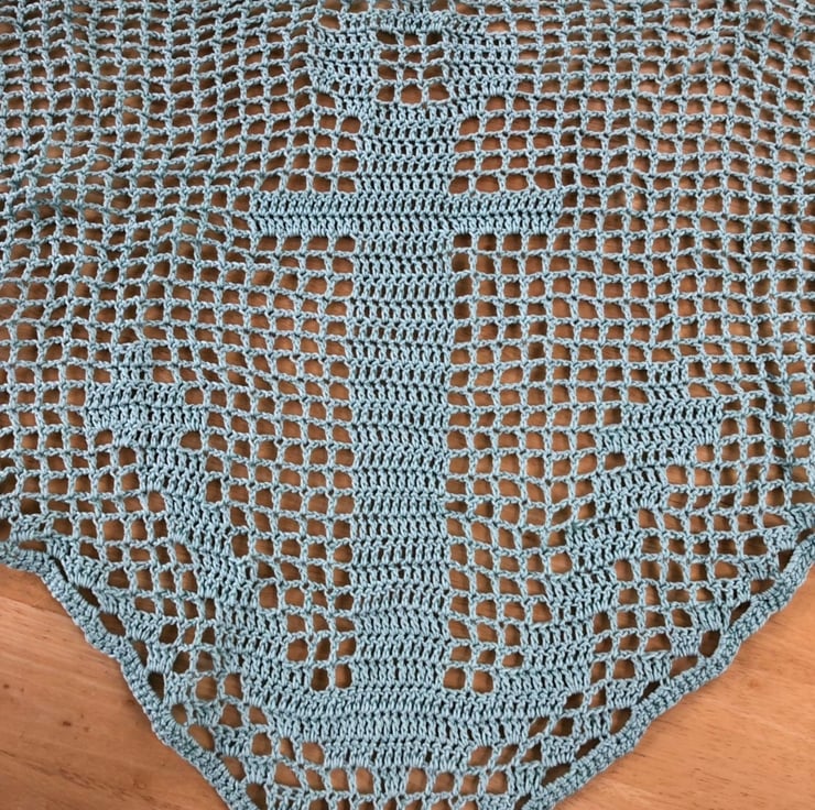 This was crocheted using cotton yarn, using the fillet technique to create the anchor. I have added ceramic beads to the tassels.