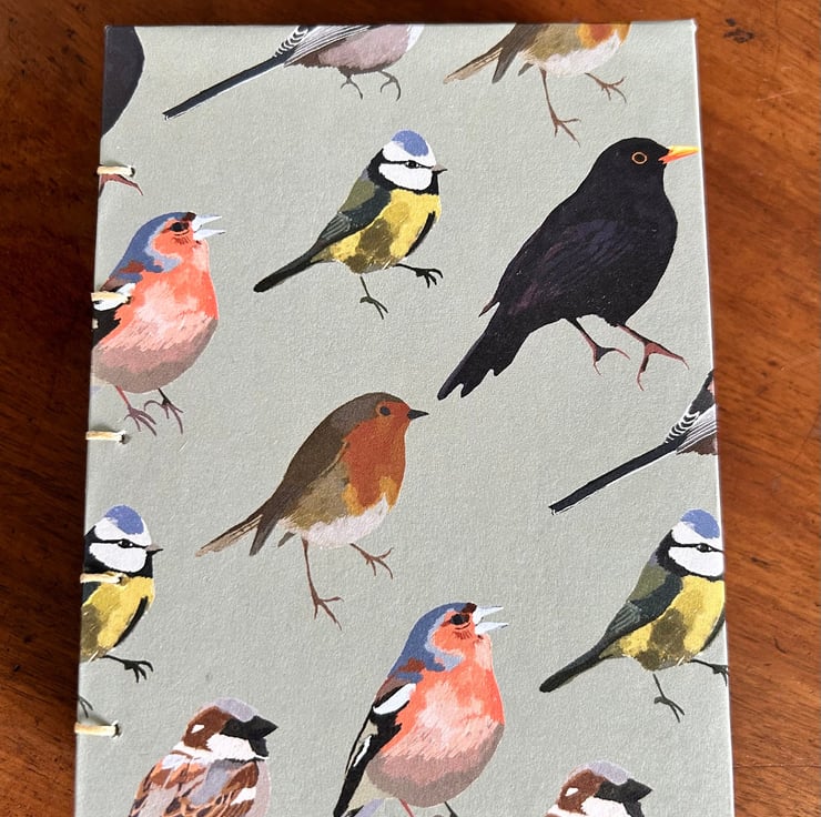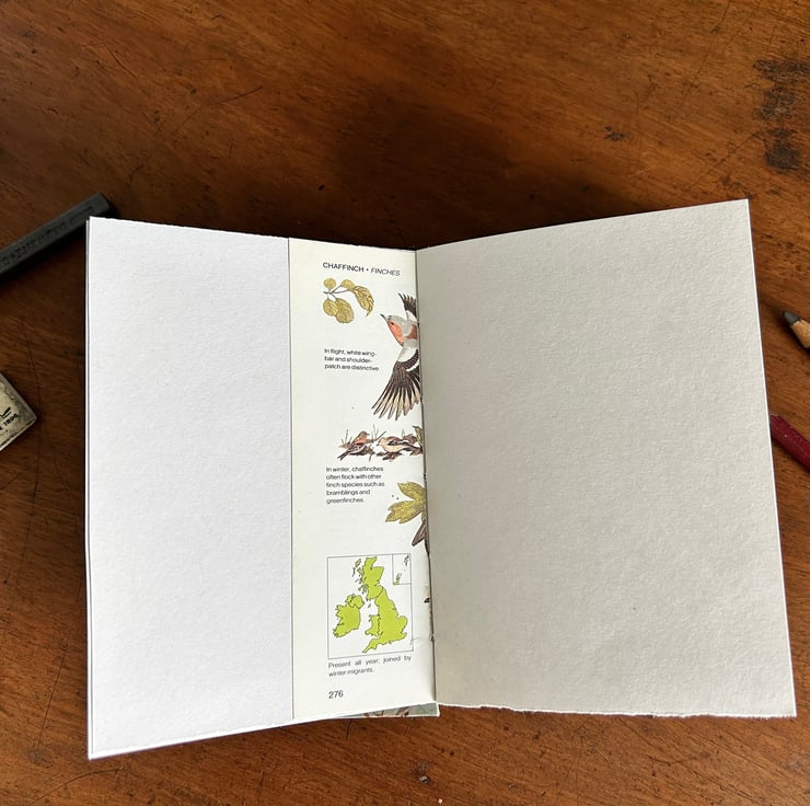 The front and back covers are a British birds themed paper. Inside are five signatures each consisting of a selection of pages from the Readers Digest book of British birds alongside cartridge paper. There are plenty of blank pages for your use.