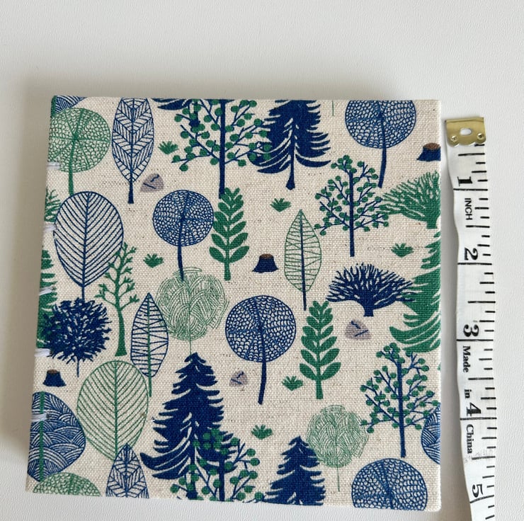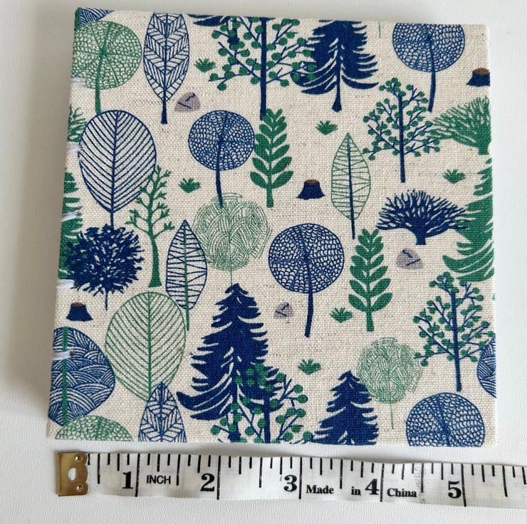 A one of a kind handmade, hand bound sketchbooknotebook. The front and back covers are a Japanese linen Forest fabric. Inside are five signatures each consisting of a quality sketchbook paper. Six pages per signature.